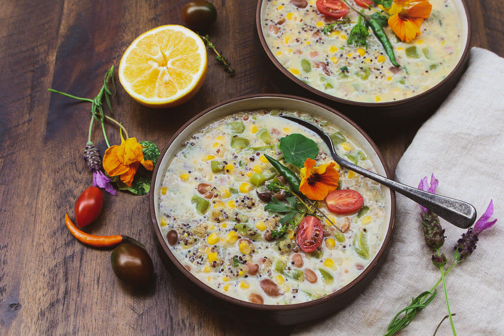 I created this wholesome, rustic chowder based on the three plant-powered staples in Peru: quinoa, corn, and beans. When you combine these three plants together, you get quite the nutrition wallop of protein, fiber, slow-digesting carbs, minerals, vitamins, and phytochemicals. These ingredients are perfectly in step with the fall season too.