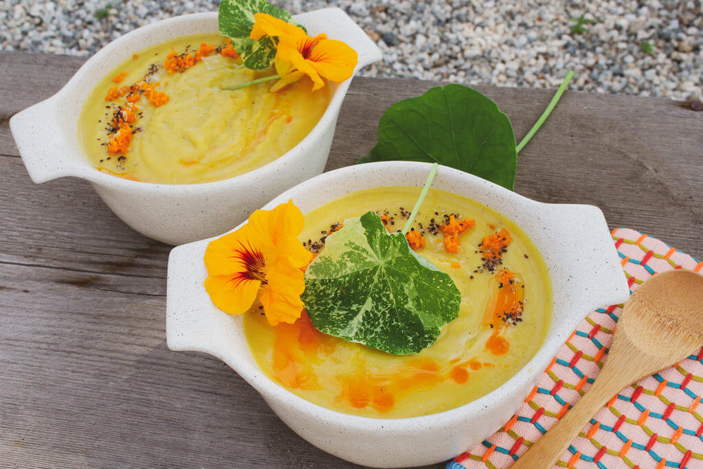 I’m in love with creamy, squash soups, like this Carnival Squash Soup with Fresh Turmeric. The sweet carnival squash pairs so well with the warm, earthy, spiciness of turmeric root in this satisfying soup. The color of this soup is a fabulous amber-chartreuse shade, which depends a bit on the color of your squash. Each time I make this soup, the color is slightly different—such is the variety of squash found in Mother Nature! The fresh turmeric adds a truly intense color to the soup, too.