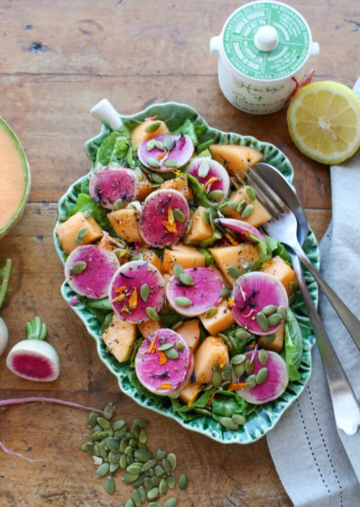 Radish Salad with Cantaloupe and Pumpkin Seeds, Sharon Palmer, MSFS, RDN, The Plant-Powered Dietitian (shown above)