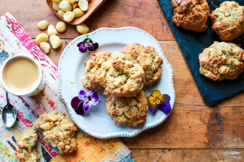 Yum! These golden, flavorful cookies disappeared in seconds in my house! A plant-powered spinoff from the classic White Choc Macadamia cookie, my cookie recipe is modest in sugar, and packed with the power of chia, flax, coconut, and almond flour!
