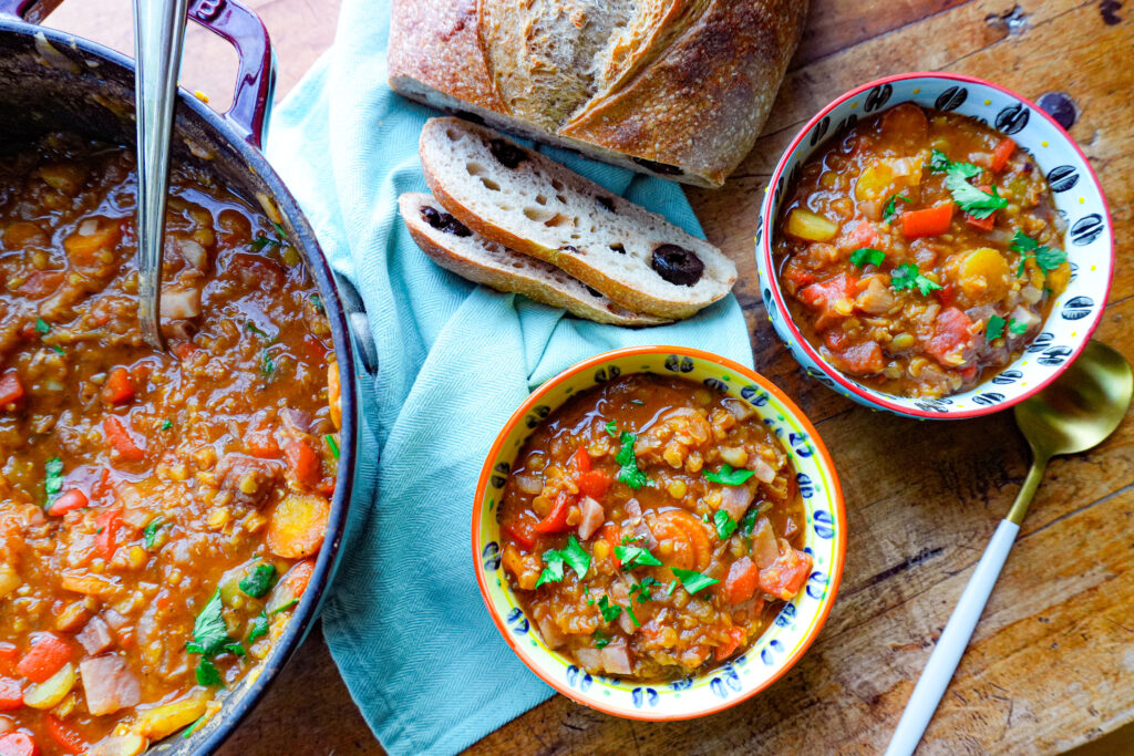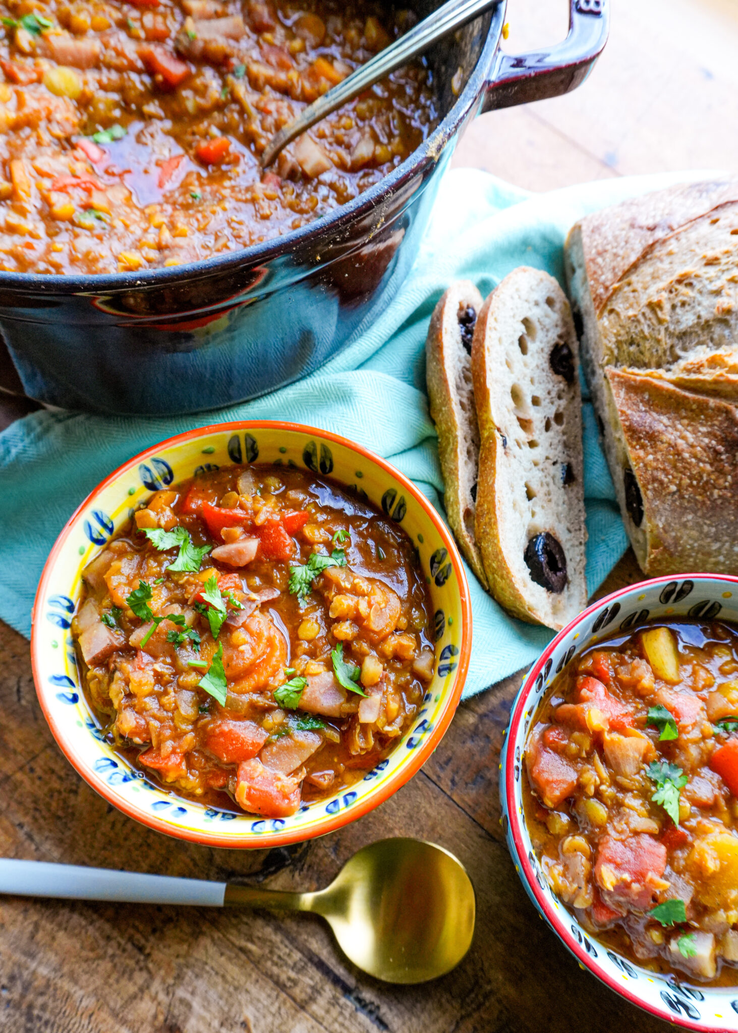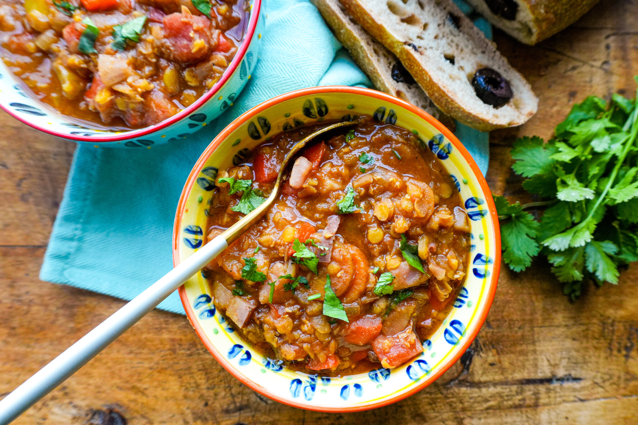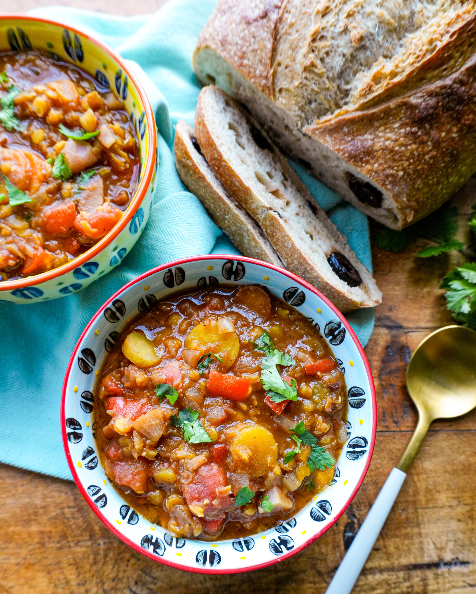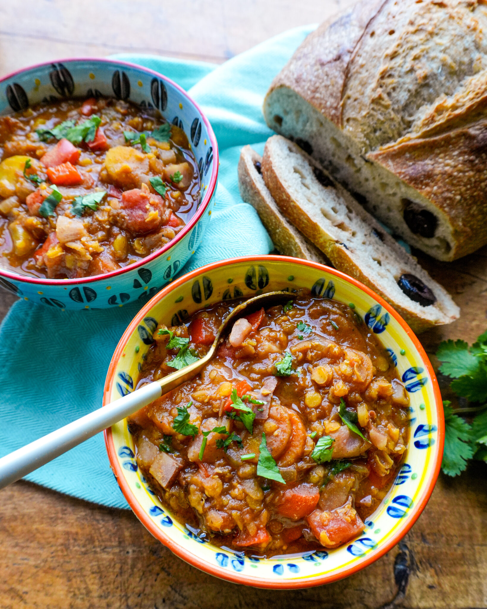 This soup features yellow lentils, sometimes called golden lentils, which you can find in well stocked markets, global markets, and online. Note: if you use split yellow lentils, the stew takes a shorter time to cook.