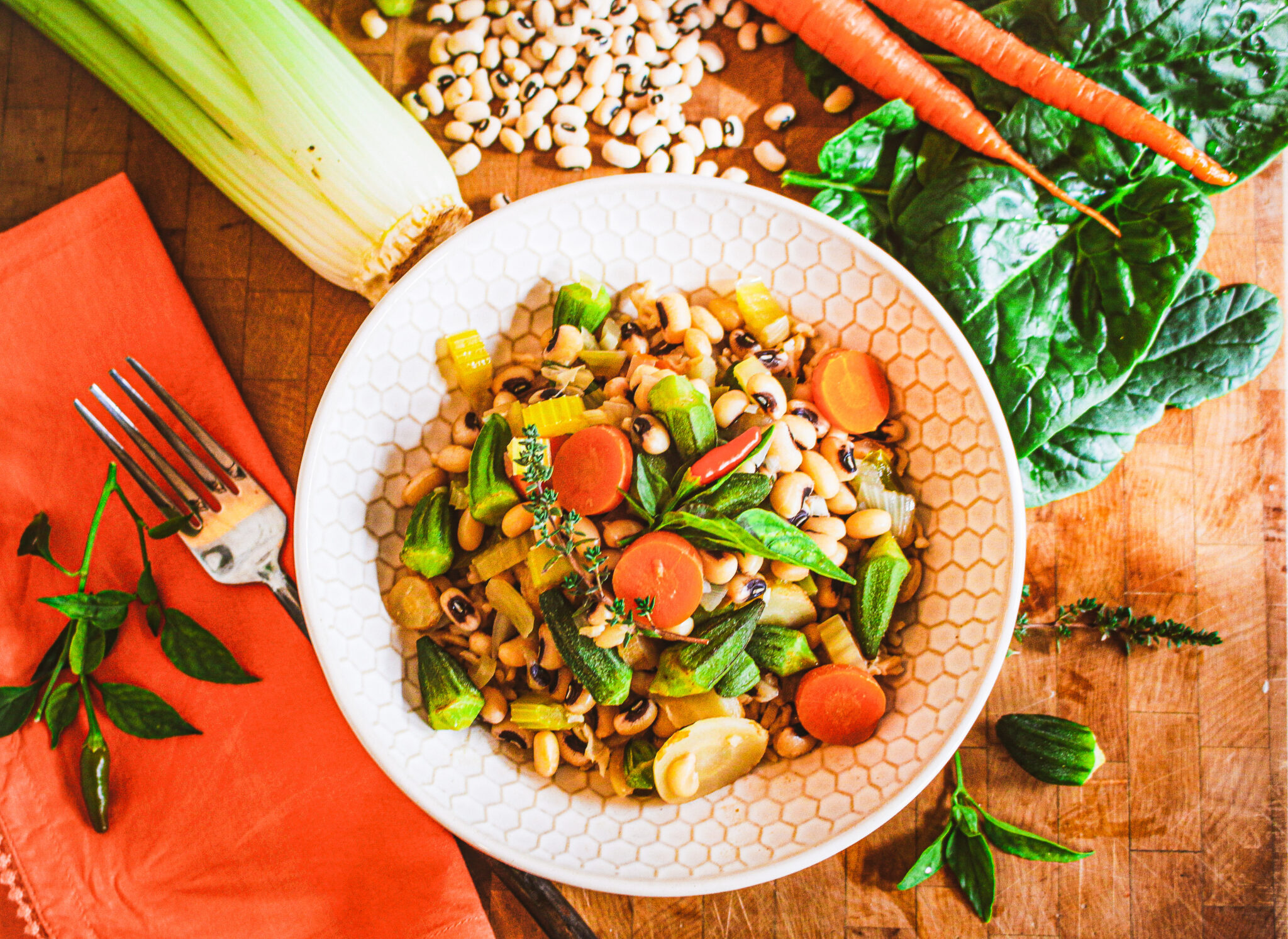 In my mother’s Southern traditions, black-eyed peas are served with greens for good luck on New Year’s Day. My plant-based version of this Hoppin John recipe—an homage to my mom’s Southern roots—leaves out the bacon or ham hocks in favor of another Southern favorite, okra. My mother grew black-eyed peas on her Arkansas farm, and they were on the menu regularly in our home in the Pacific Northwest. I remember a pot of black-eyed peas bubbling on the stove most weeks, their savory, earthiness filling the kitchen with such a comforting aroma. Okra recipes were another favorite in our home.