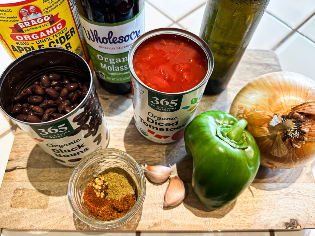 Add the tomatoes, tomato paste, black beans, molasses (or maple syrup), and vinegar to the mixture.