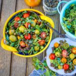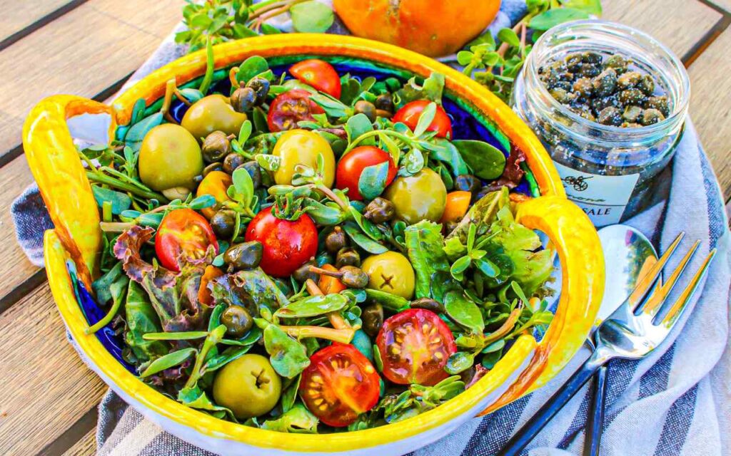 Purslane is delicious in this traditional vegan, gluten-free Mediterranean recipe for Sicilian Purslane Salad, which includes wild or foraged purslane, lettuce, cherry tomatoes, olives, capers, balsamic vinegar and olive oil.