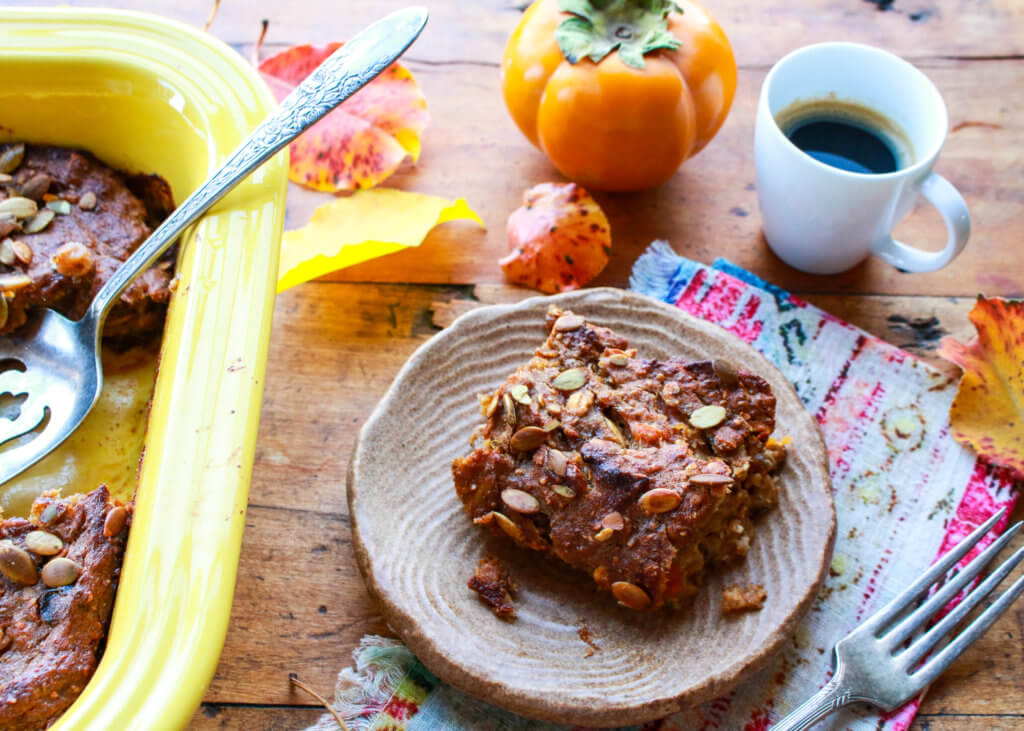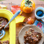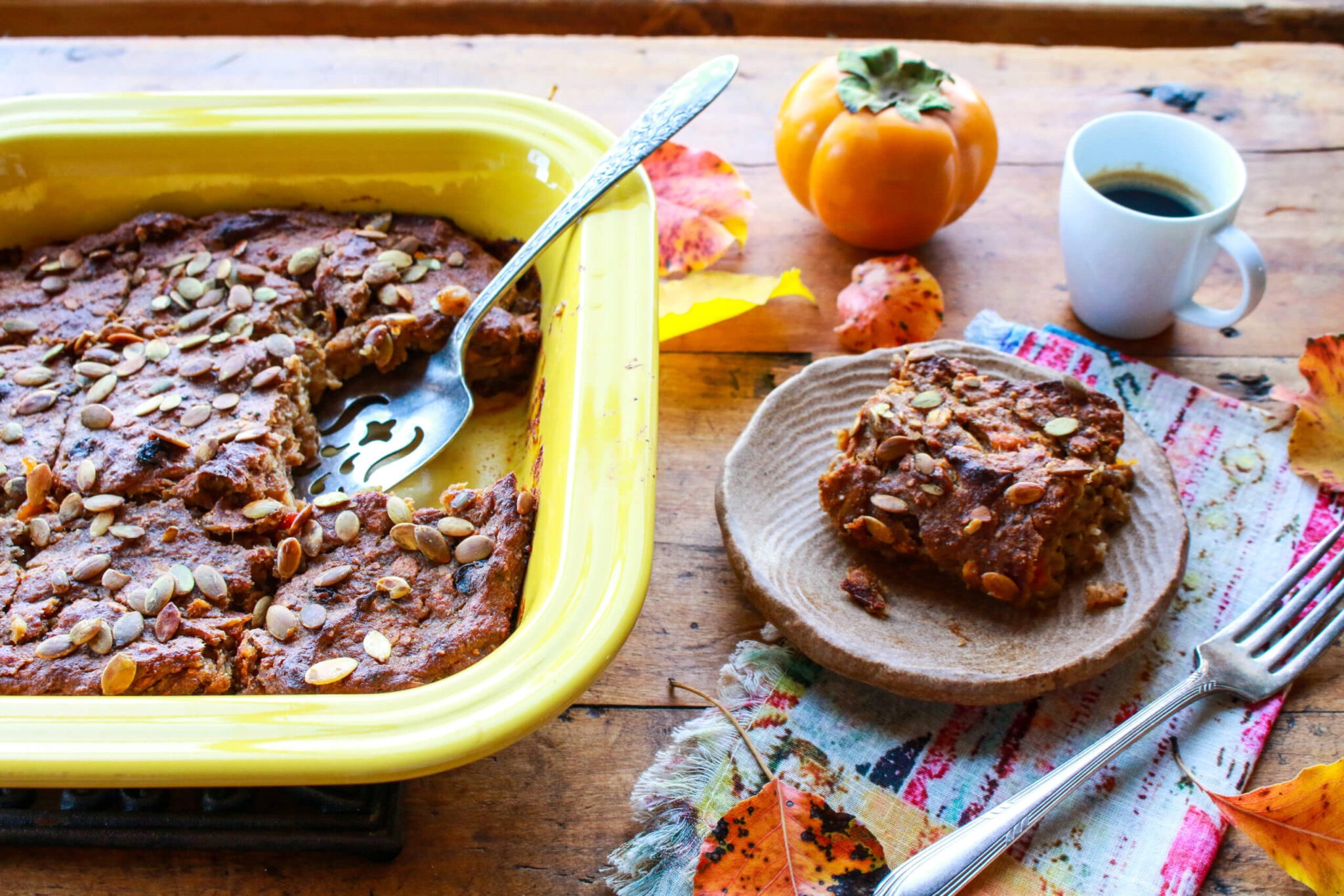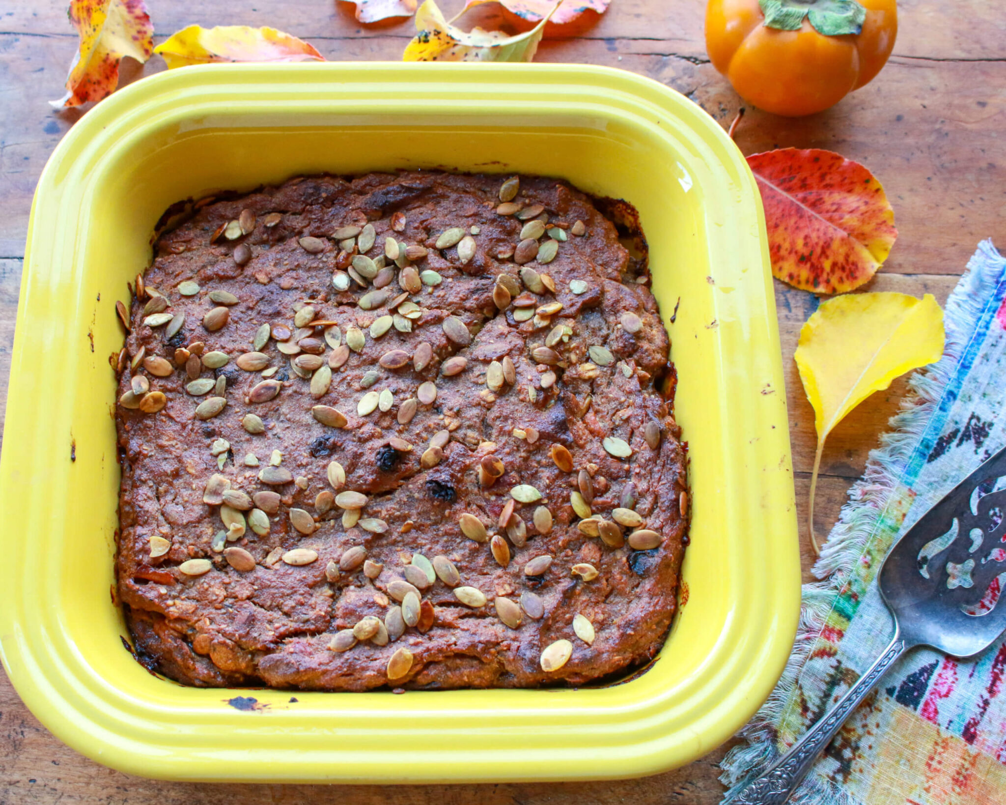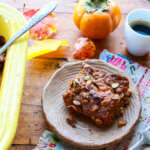 This healthy, vegan cake recipe, Persimmon Cake with Spices, is a delicious blend of cobbler and cake. This fruity persimmon cake is filled with the flavors of ripe persimmons, whole grains, spices, and hemp, chia, and pumpkin seeds.