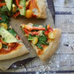- At the last minute before serving, remove the crust from the oven and top with the arugula and baby spinach, tomatoes, bell pepper, avocado, and pistachios. The greens will wilt quickly.