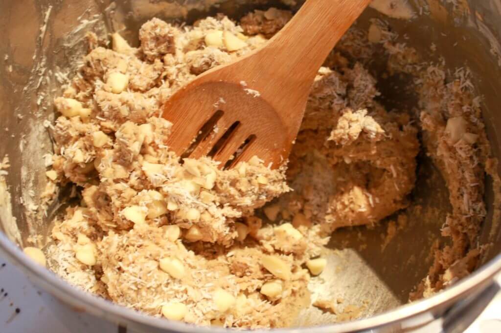 - Stir in macadamia nuts, coconut, and white chocolate chips.