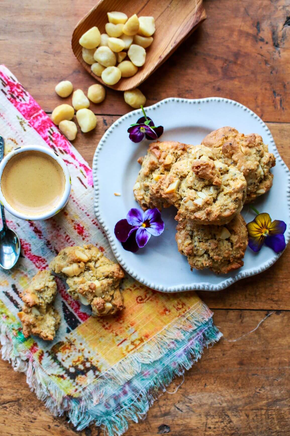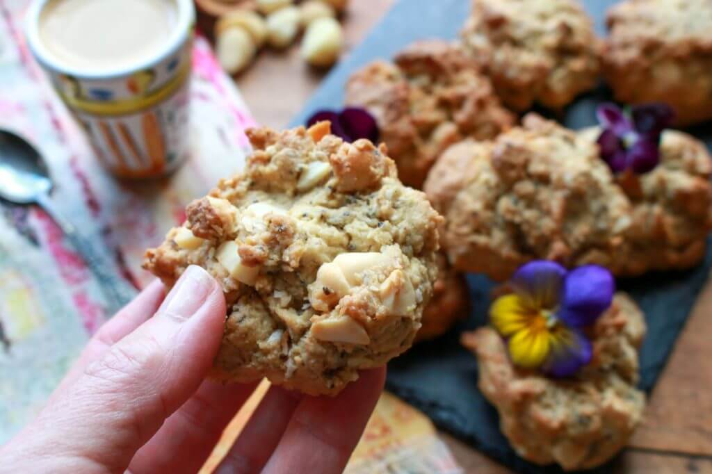 A plant-powered spinoff from classic white chocolate macadamia nut cookies, this yummy vegan cookie recipe is modest in added sugars, and packed with the power of chia, flax, coconut, and almond flour. As delicious as they are pretty!