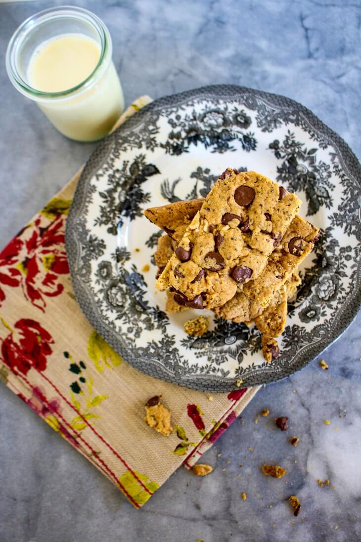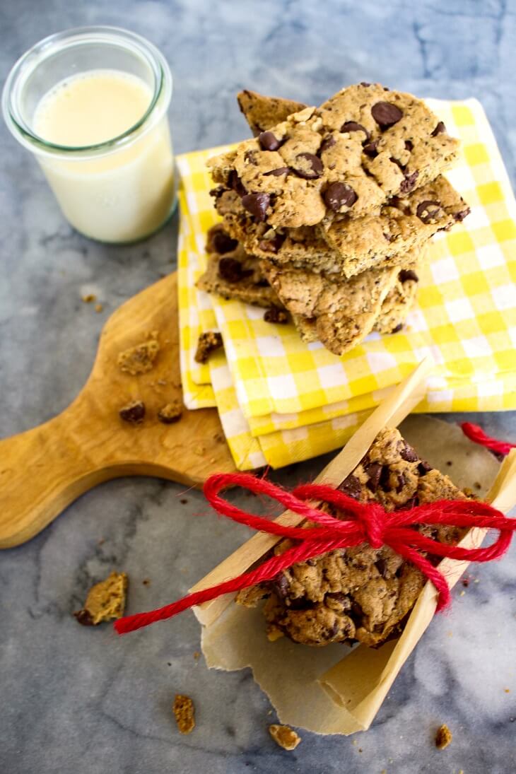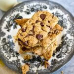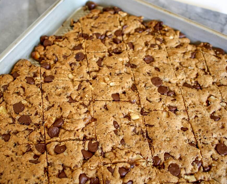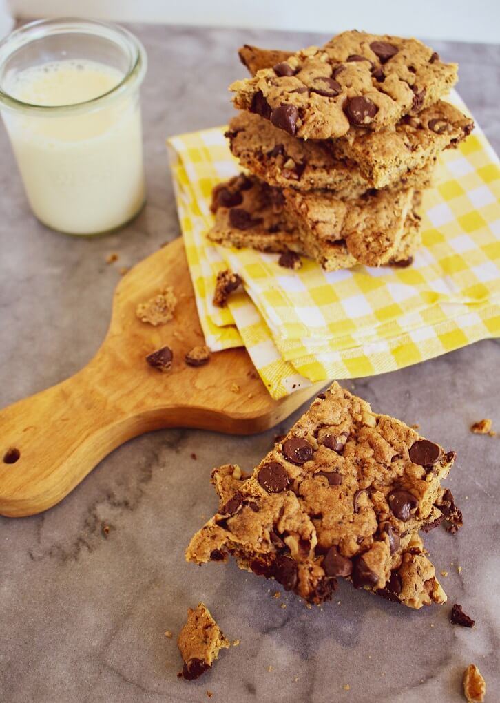 These vegan Tollhouse Pan Cookies are as easy as can be; just mix up the dough, pat it out on a baking sheet, pop it in the oven, and slice them into bars.