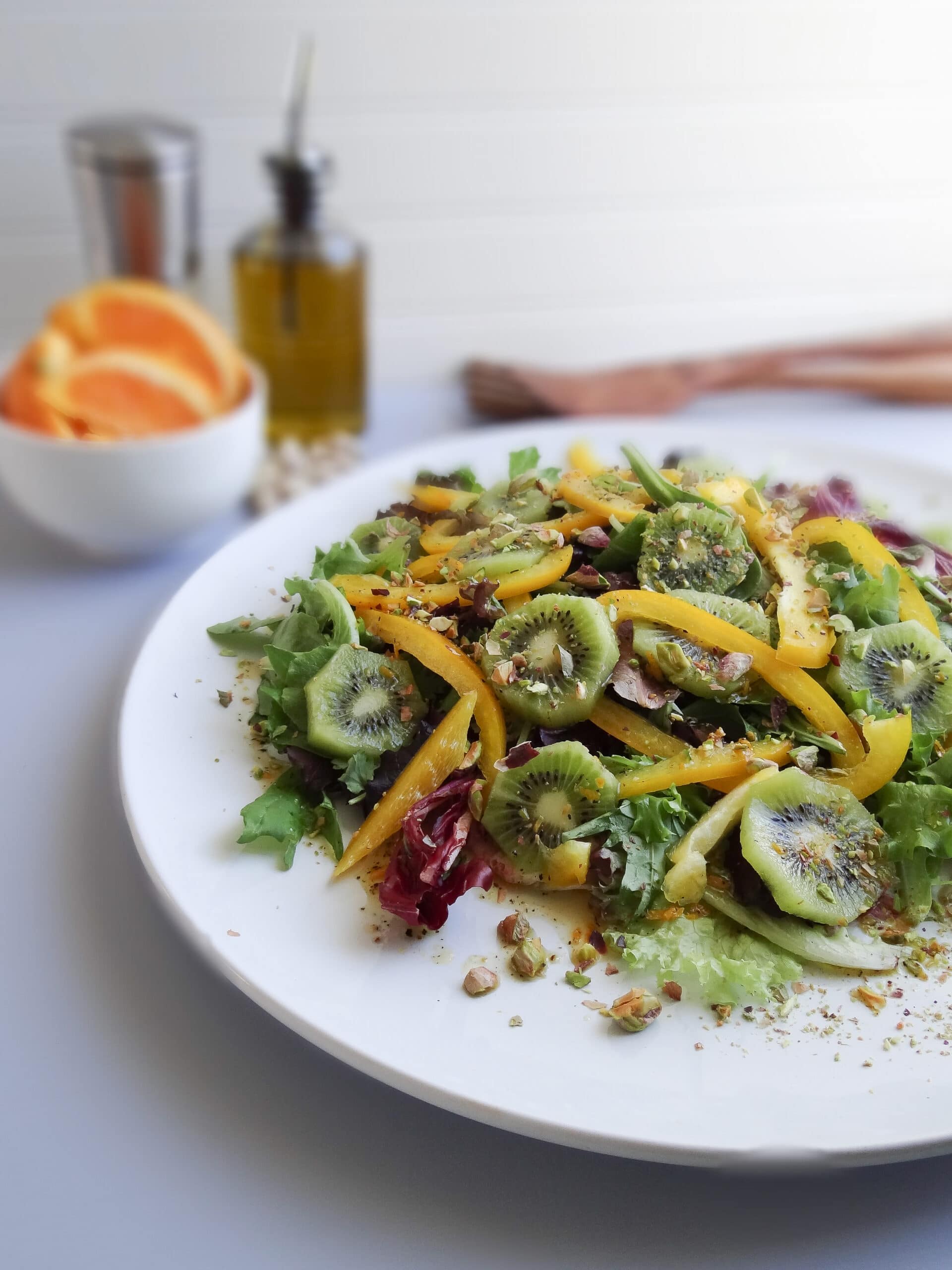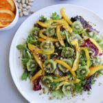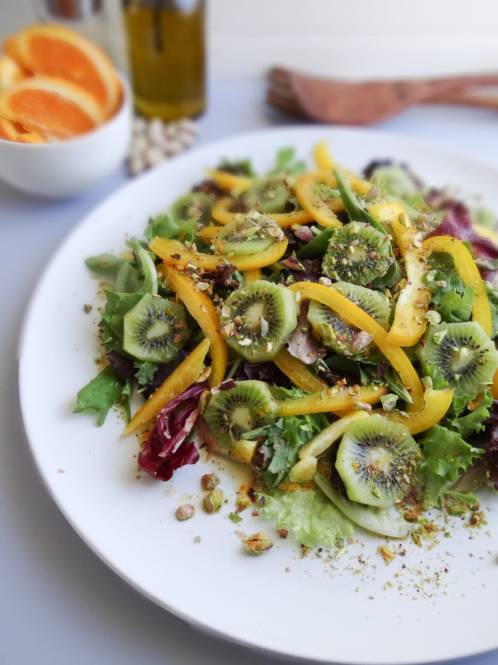This easy, 5-ingredient vegan, gluten-free salad shines with the bright flavors of orange, kiwi, salad greens, and pistachios.