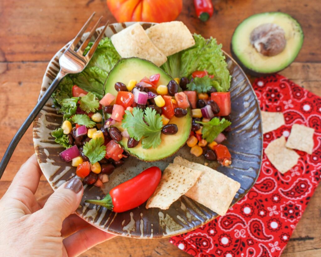 If you’re looking to impress with a sophisticated stuffed avocado salad recipe that is super simple, gorgeous, and utterly delicious, then give this Stuffed Avocado with Southwestern Black Beans a try. Completely plant-based (vegan) and gluten-free, and made without added oils, salt, or sugar, this recipe is made out of all whole, natural plant foods, filled with disease-protective qualities. With limited ingredients (many of which are shelf stable), you can make this fabulous stuffed avocado dish in about 10 minutes. The true inspiration is a couple of ripe avocados. Then turn to a few staple ingredients—canned black beans, frozen corn, onions, tomatoes, spices, and herbs—and you are good to go!
