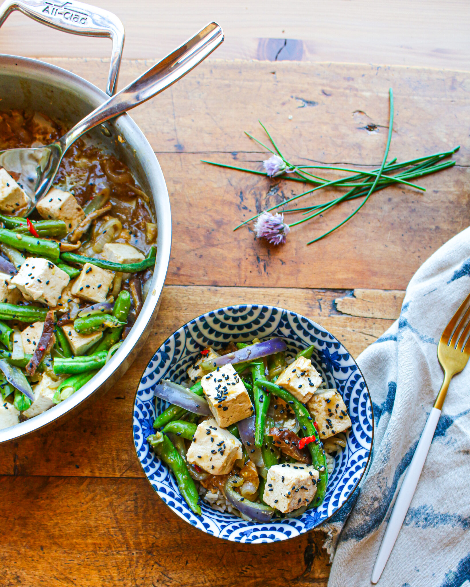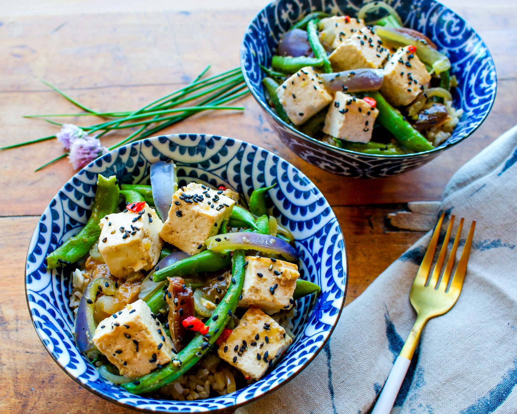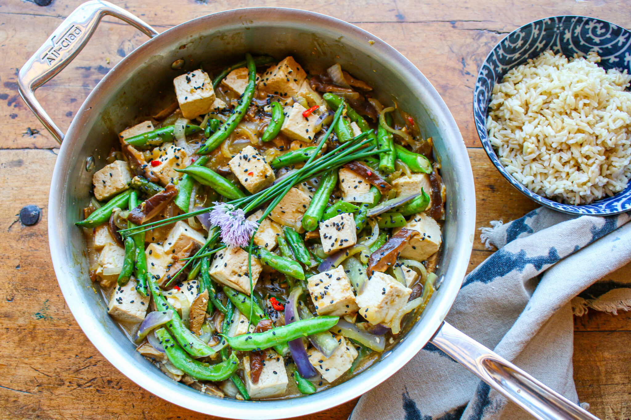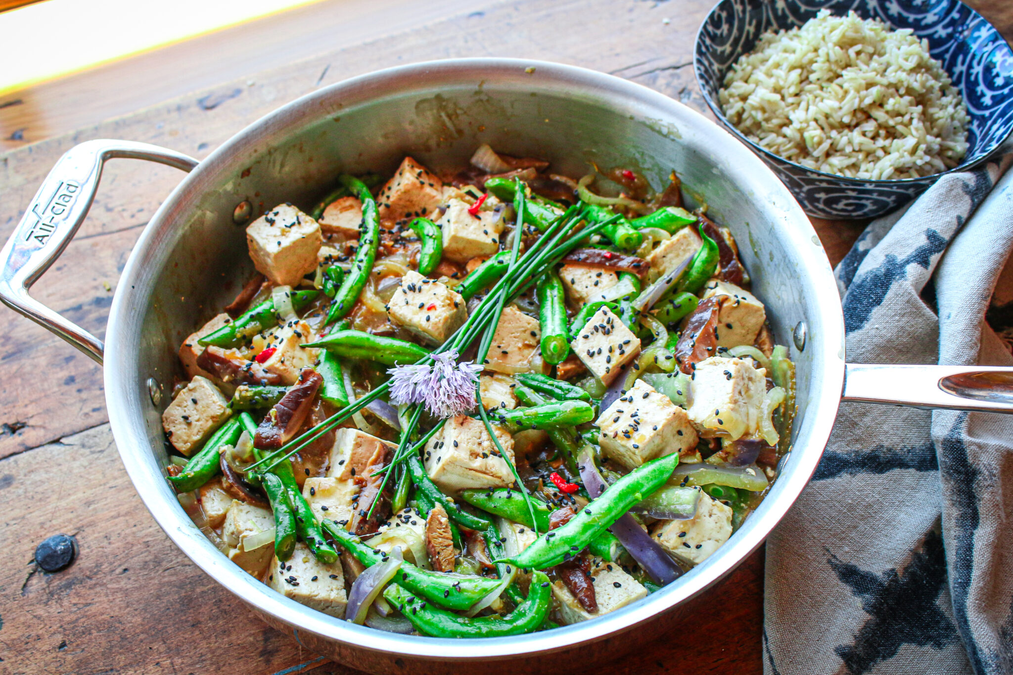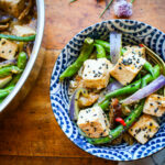 This is a great family meal, serving four portions; or it’s a wonderful way to enjoy a meal for two one night, and savor the leftovers the next day. It holds up quite well microwaved the following lunch or dinner. You can easily switch up the green beans for another vegetable, such as asparagus, zucchini, eggplant, or green peas. Alter the color of bell pepper, such as purple, orange, and red, to provide a different pop of color. I love the addition of tofu here—a plant-based, traditional, superstar in the plant-based protein world. As an alternative, you could also try tempeh in place of tofu. I featured this recipe on a TV segment on KTLA 5 Morning Show, and it was a huge hit with the hosts of the show, as well as the backstage crew, who lapped up my leftovers in no time.