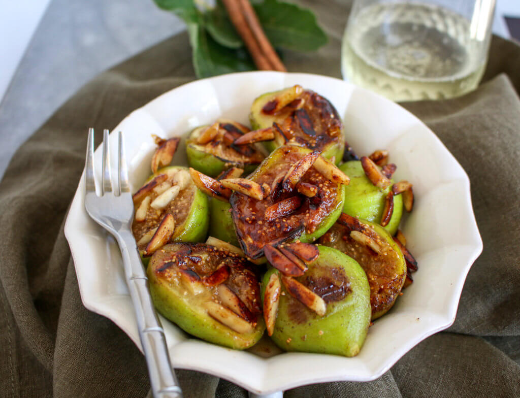 Let fig season inspire a simple, fruit-forward dessert you can whip up in moments: Sautéed Figs with Cinnamon and Almonds. Figs grow plentifully in Mediterranean climates, such as California, which is why I have a Mission fig tree growing in my back yard. If I’m not careful, the deer will harvest those ripe figs before I get a chance, they are so treasured in my garden. I’ve also seen figs growing wild in Greece and other parts of the Mediterranean—making up a very important part of that diet. They love the sunshine, and don’t need much fuss to grow. Figs come in many varieties—different colors, textures, shapes—and are one of nature’s most versatile fruits, pairing well in savory, as well as sweet dishes. Watch for fig season to arrive at your farmers market or supermarket in the late summer to early fall, and enjoy these luscious fruits when they are available.