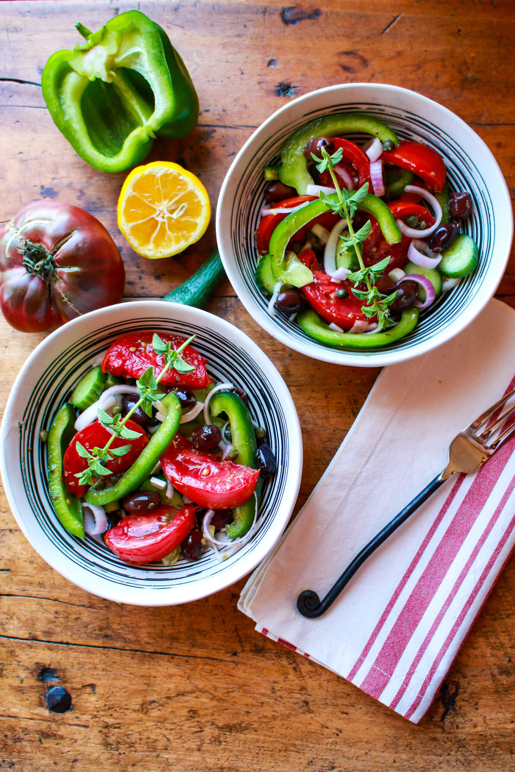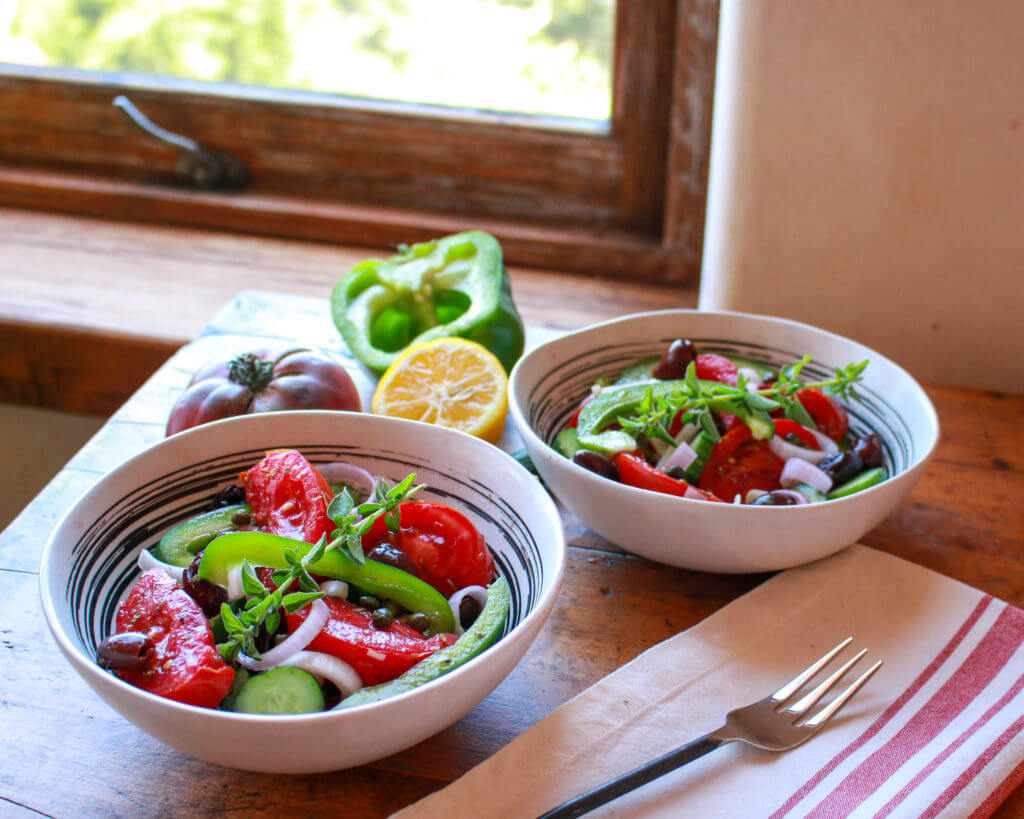 This traditional, plant-based Greek Salad will take you on a trip to Greece, thanks to the key ingredients of extra virgin olive oil, olives, tomatoes, and capers.