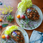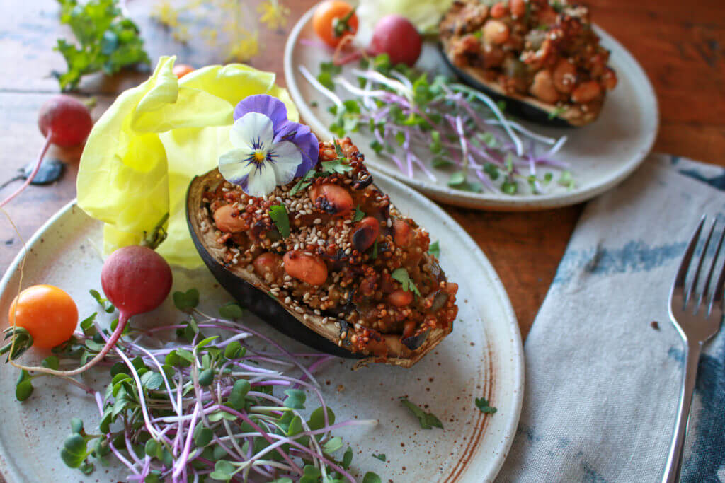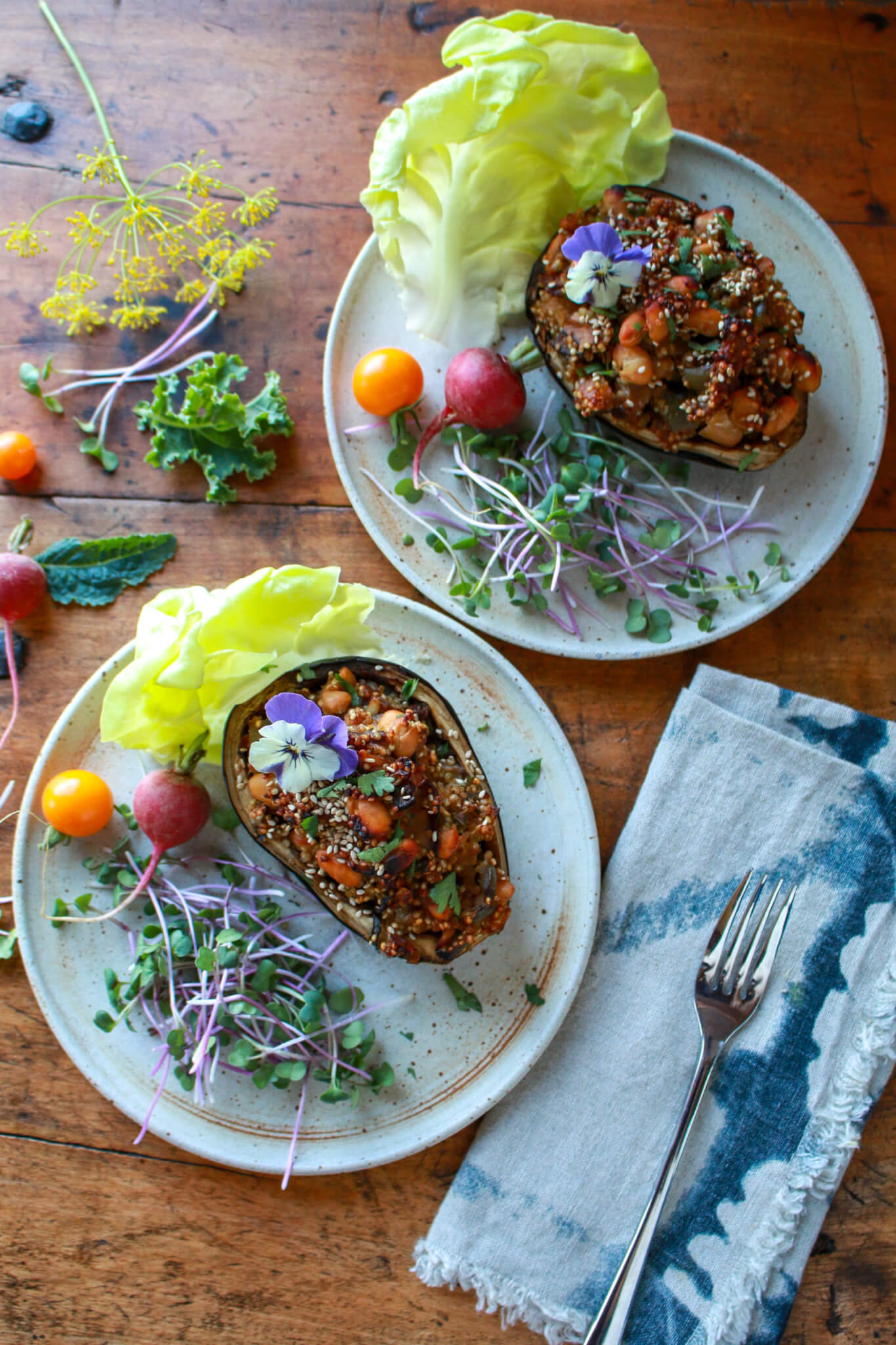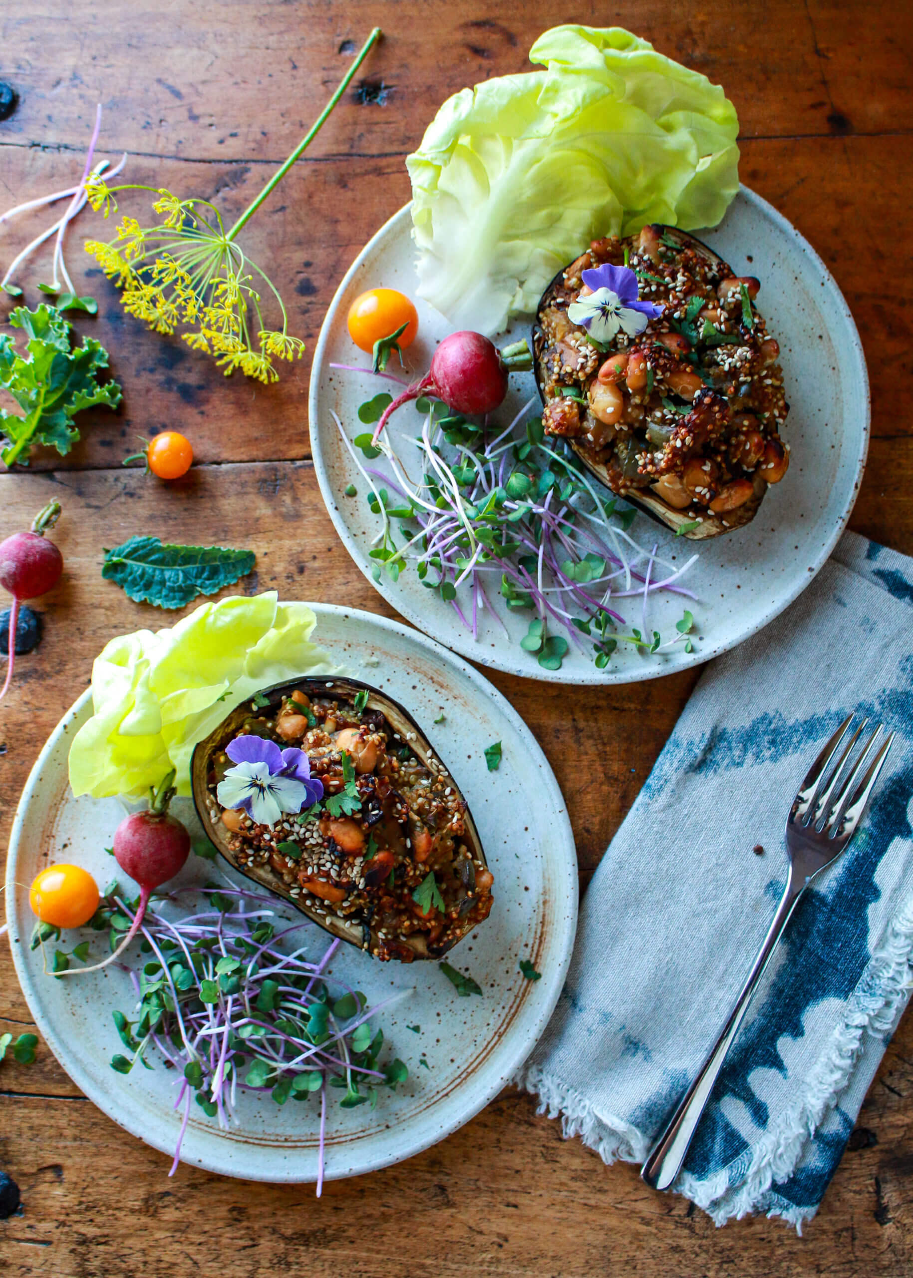 Eggplants make the perfect, purple vessels for this completely plant-based (vegan), gluten-free savory stuffing with quinoa, miso, beans, mushrooms, peppers, and ginger.
