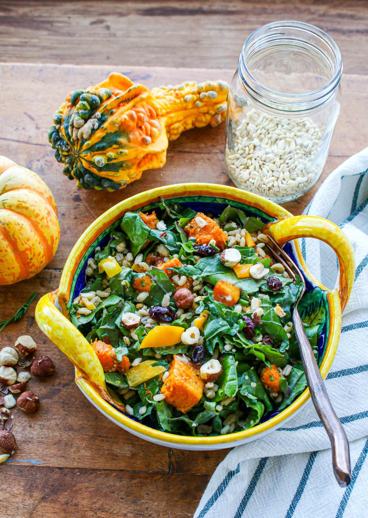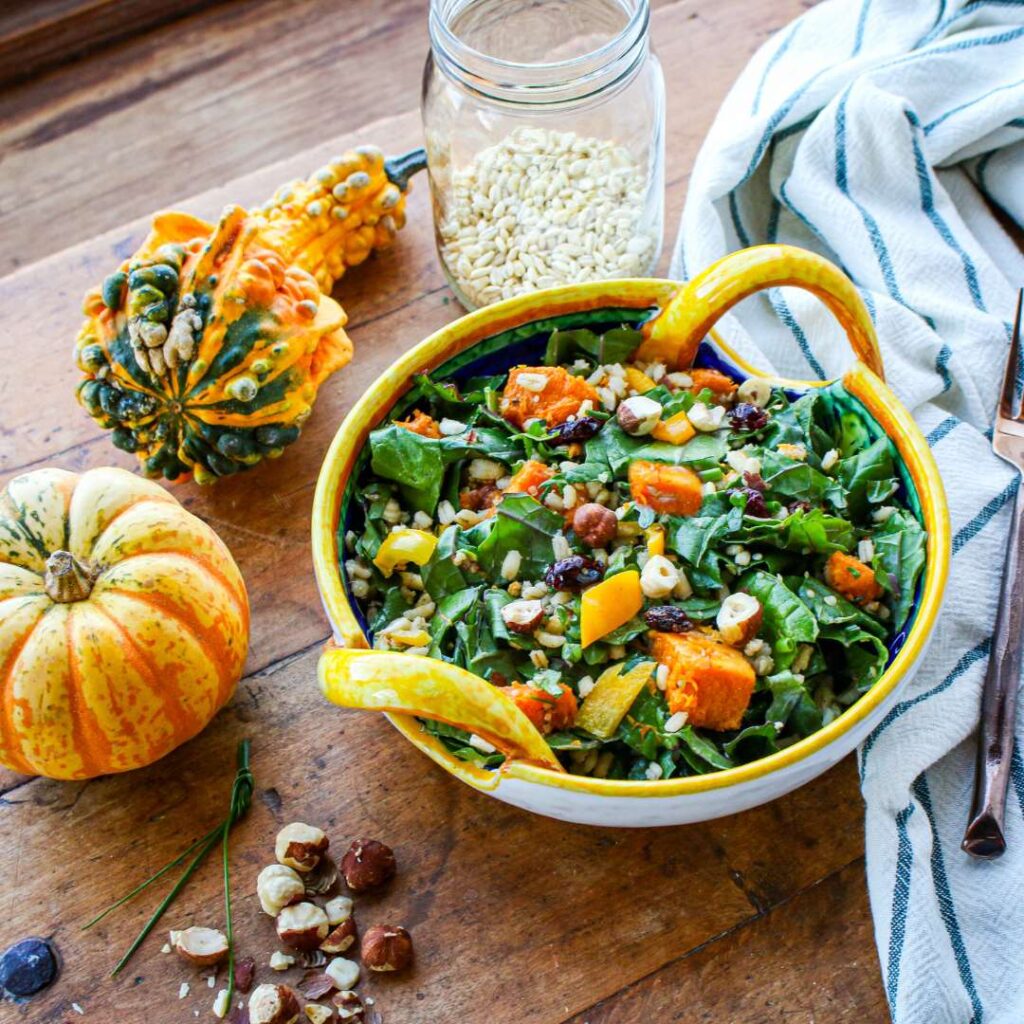 This hearty, delicious Butternut Squash Salad with Barley and Kale—tossed with a tahini dressing—is a perfect seasonal healthy salad recipe to celebrate winter squash, whole grains, leafy greens, and hazelnuts.