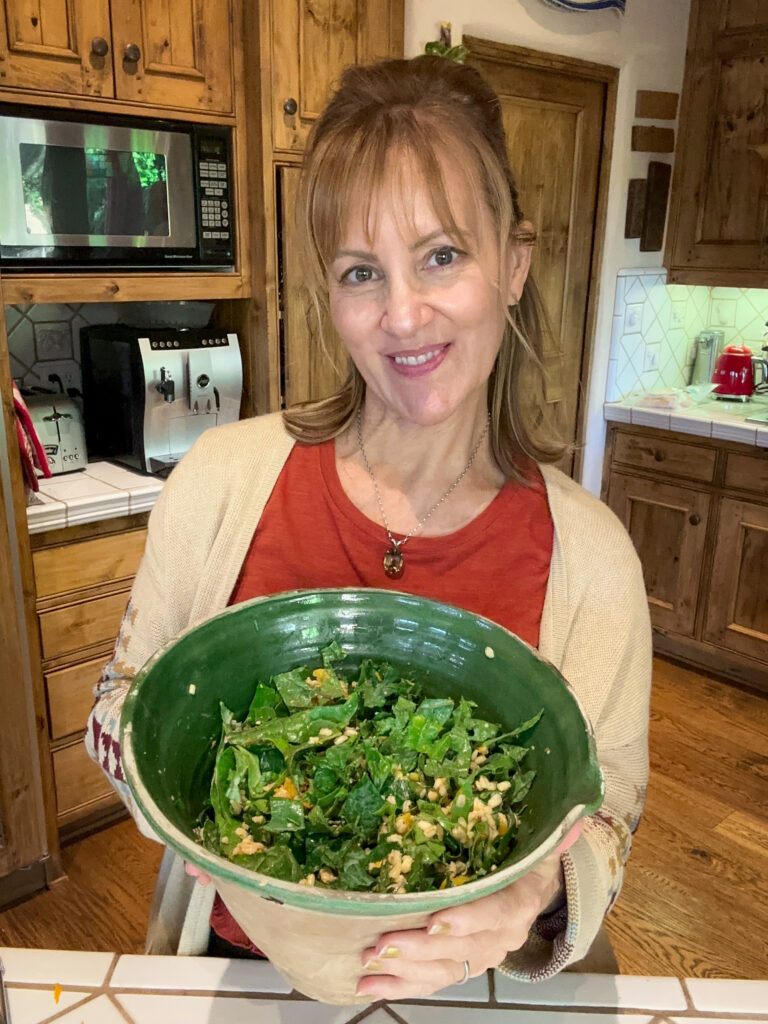 - While barley and squash are cooking, prepare salad. Place chopped kale in a large bowl.