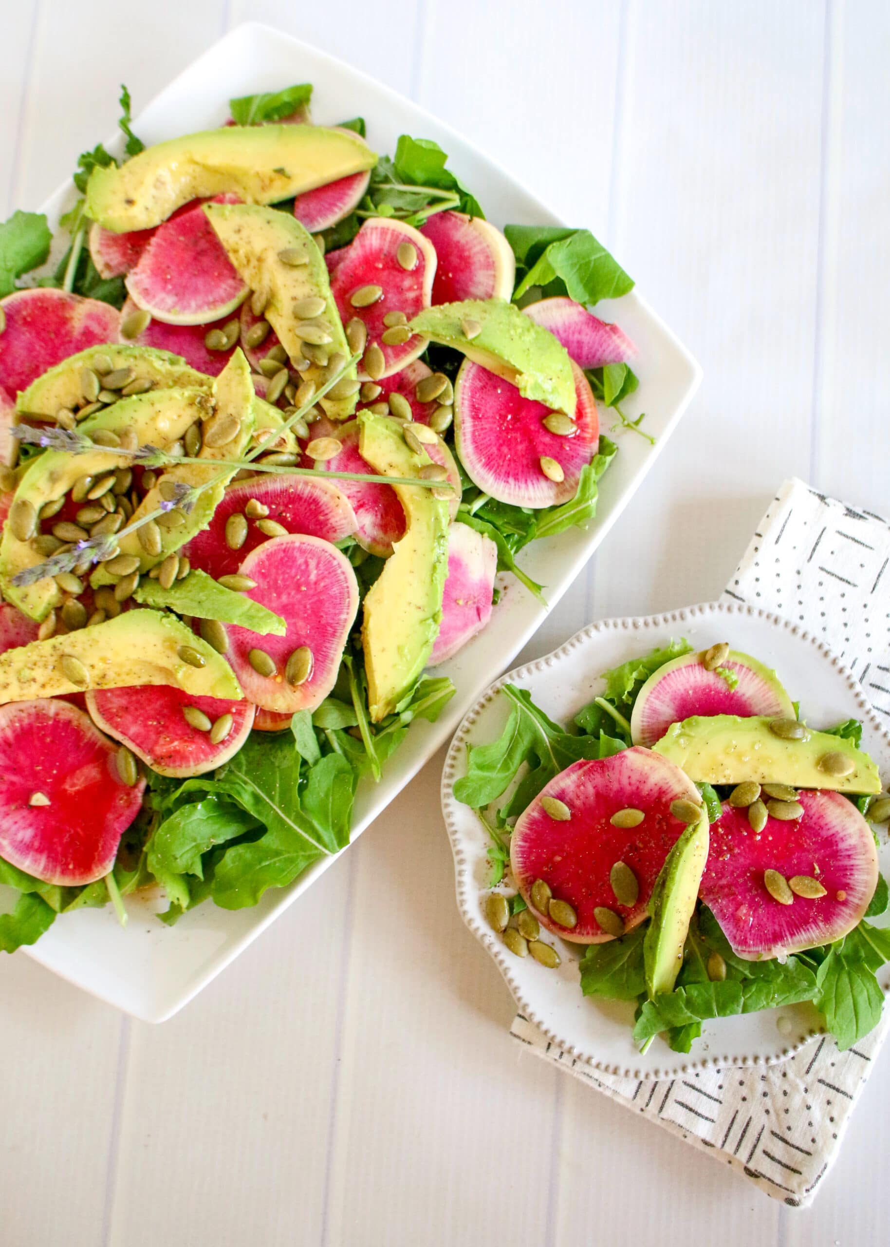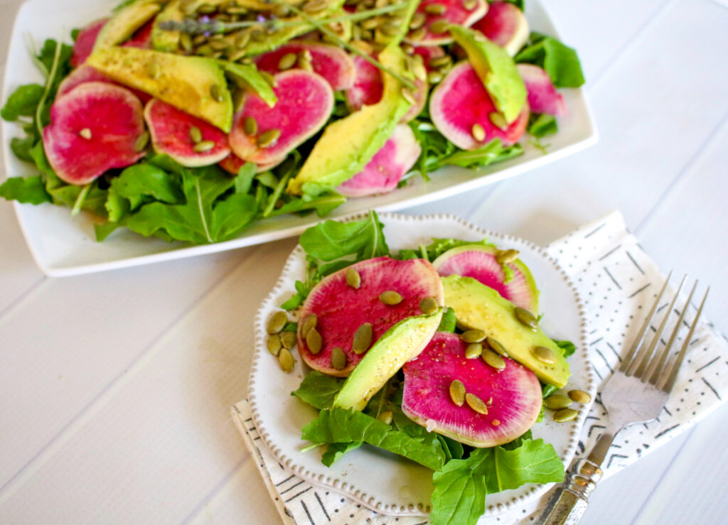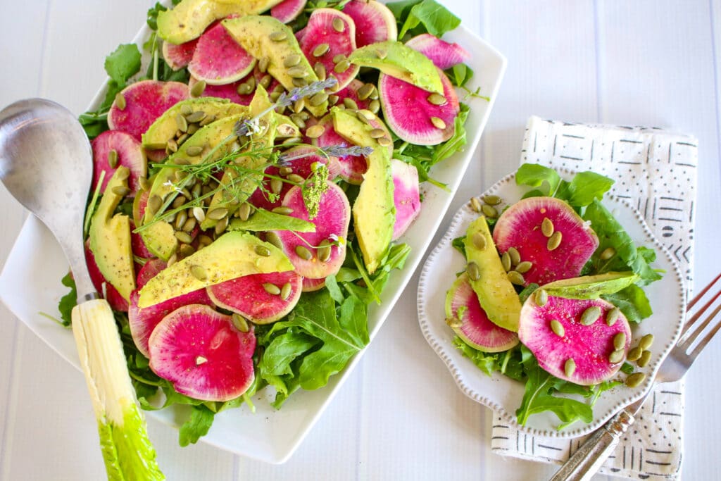 The gorgeous shades and fabulous flavors of radishes, avocados, arugula, and pumpkin seeds come together in this easy, plant-based, gluten-free Arugula Salad with Radishes and Avocados.