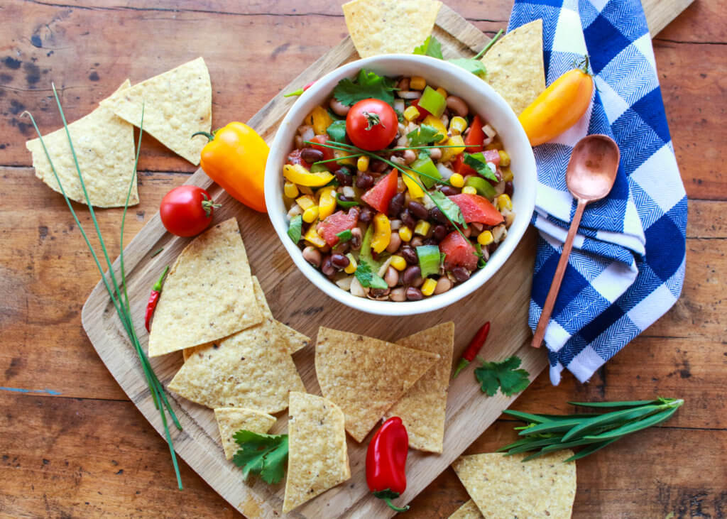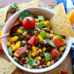 I absolutely adore this colorful recipe served with baked tortilla chips or whole grain pita bread for an appetizer course. It’s also good as an accompaniment with Latin fare, such as fajitas, quesadillas, and tacos. It’s really delicious as a savory relish to accompany recipes like potato casserole, lentil patties, and veggie balls. And it’s just plain good as a salad or side-dish all by itself. There are just so many great uses for this tasty, vibrant dish. It holds up well, so that you can make it one day, and enjoy it for a few days afterwords. Pack it up in your lunch box the next day. Just serve it on a big pile of leafy greens and you have a wonderful meal in one.