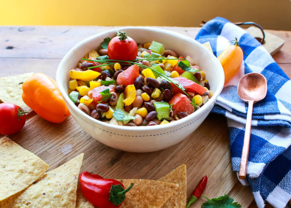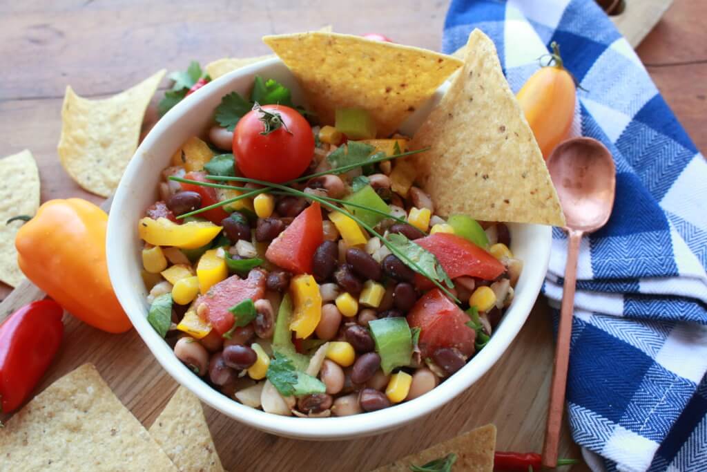 One of the best things about this recipe is that it is based primarily on foods you can find in your pantry—canned black-eyed peas, black beans, and corn; garlic, onions, vinegar, olive oil, dried spices. Just add a few fresh items—tomatoes, peppers, and cilantro—and you have a versatile dish whipped up in minutes! Plus, you can pack in the nutrition power of so many colorful, whole plant foods into this yummy recipe. You can easily swap out ingredients too—trade black beans for kidney beans, and cilantro for parsley. If you like a spicy bite, you can up the spice and jalapeño, too. Check out my video on how to make this recipe too.