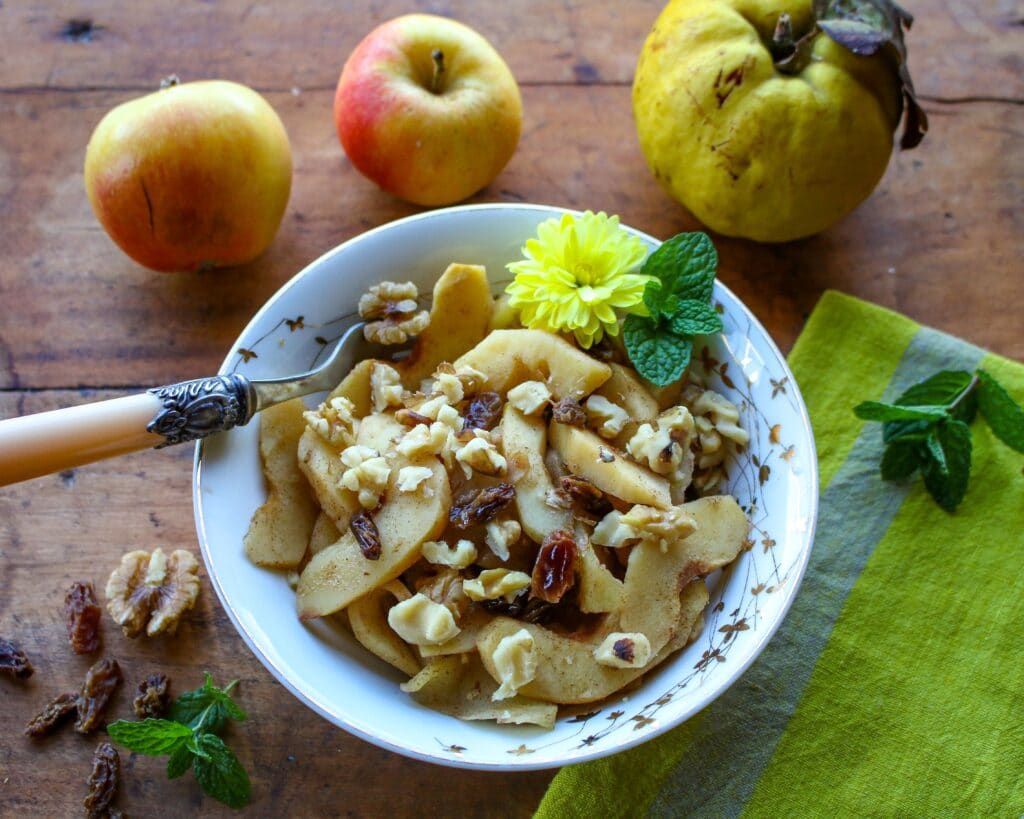 I just love fruit forward desserts, and it doesn’t get more fruit-centric than a spicy fruit compote. Served warm, it’s the perfect way to showcase the flavors of apples, pears and quinces. This soothing compote has a touch of smoky whisky, spicy ginger and cardamom, sweet raisins, and crunchy walnuts. It’s delicious served in a pretty dessert cup, or as a topping for ice cream (plant-based, of course!).