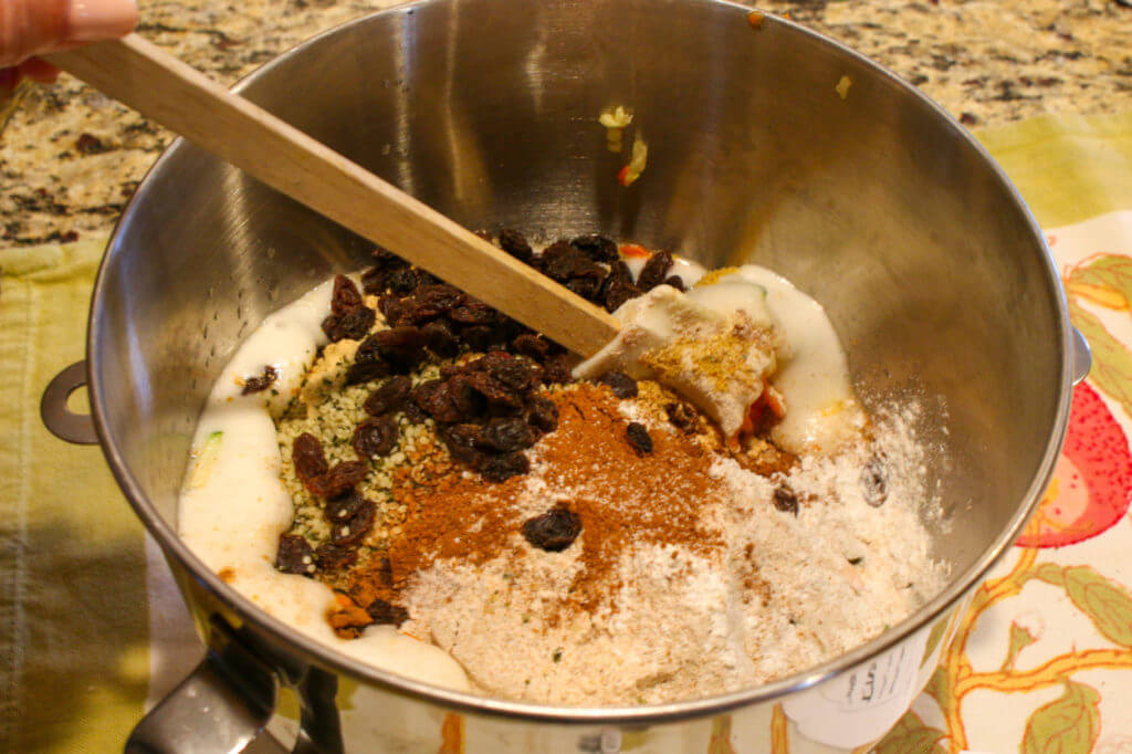 - Gently mix in whole wheat flour, nut meal, hemp seeds, baking powder, pumpkin pie spice until smooth.
