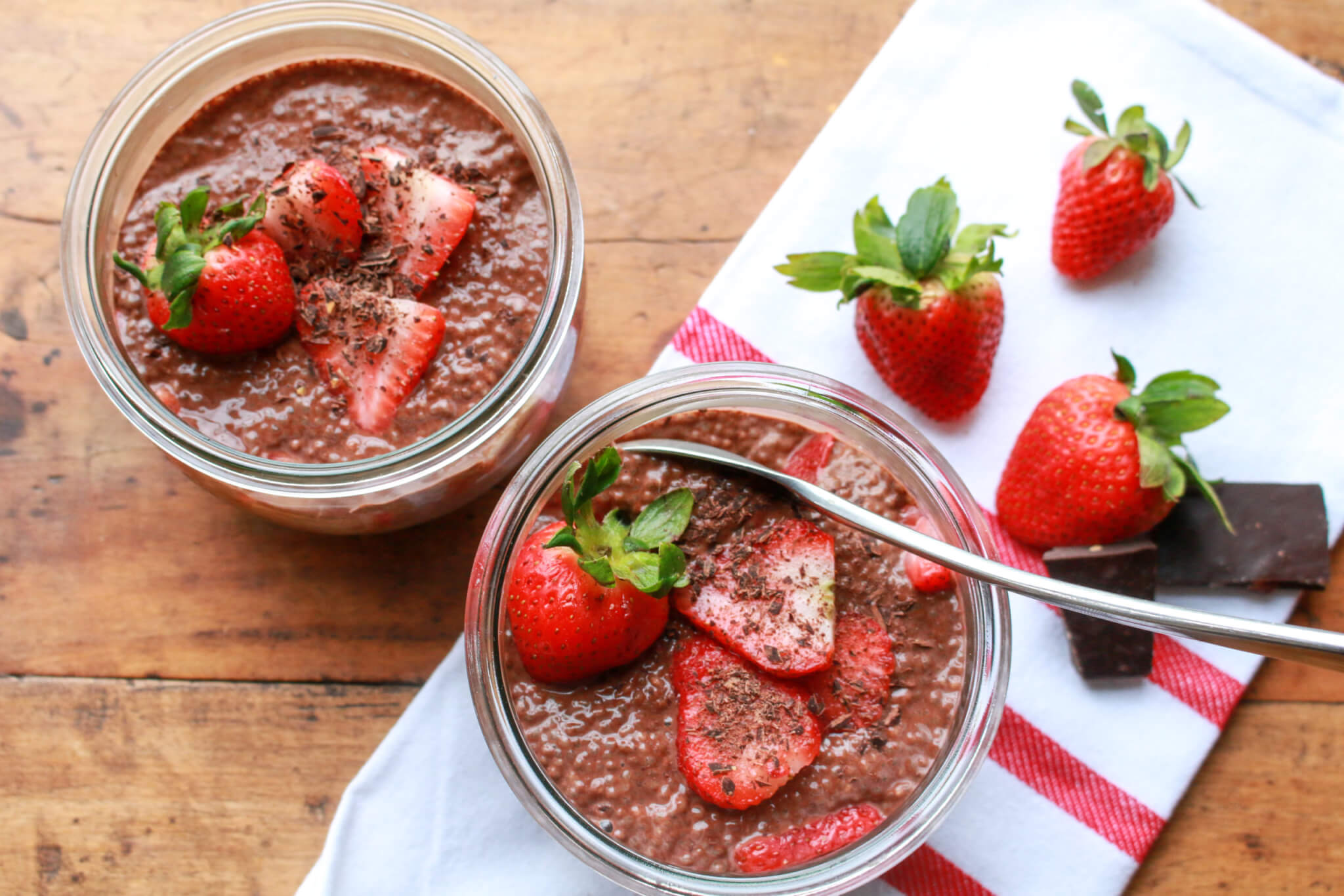 This recipe is naturally vegan, vegetarian, plant-based, and gluten-free, making it a great option for a wide variety of eating styles. It’s also perfect for meal prep—just make a batch ahead of time and enjoy it throughout the week as a healthy breakfast, snack, or light dessert. With its rich chocolate taste and fresh berry topping, this easy chia pudding proves that healthy eating can be both simple and delicious. With only 7 ingredients and just a touch of maple syrup for sweetener and no added oils, this Easy Chocolate Chia Pudding with Strawberries relies upon chia seeds to add a creamy, thickness—and a dose of healthy nutrition. Chia seeds are a good source of omega-3s, protein, fiber, and calcium, so dive right into a dessert you can feel good about! Layered with strawberries, this is a treat healthy enough for breakfast! Mix it up the night before and enjoy packed away for lunches, gym trips, picnics, or snacks. Swap out the strawberries for another type of seasonal fruit, such as pineapple, raspberries, mangoes, and persimmons. The possibilities are endless!