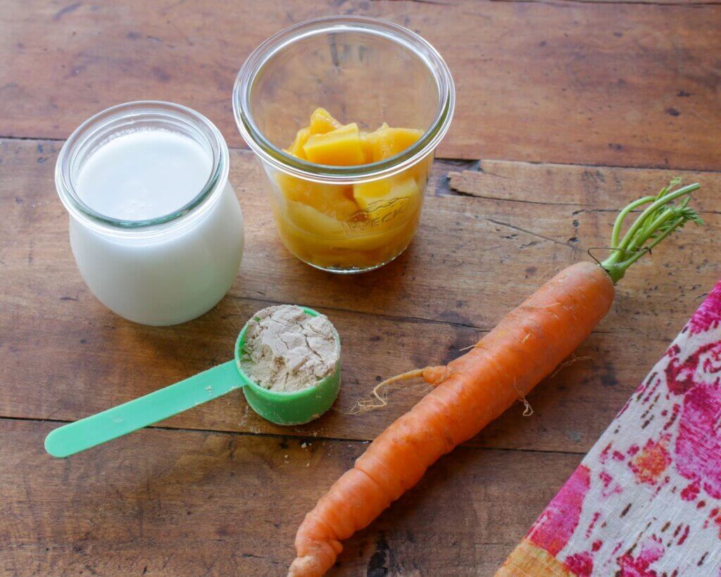 This recipe includes only 6 ingredients: protein powder, coconut milk beverage, orange juice, mango, and carrots.