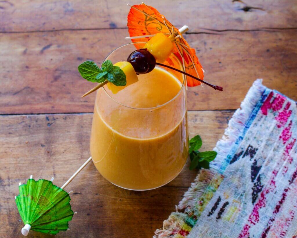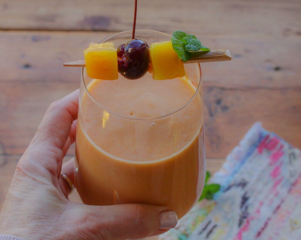 Anyone who knows me understands that I love a good smoothie. I make one for someone in my family nearly every single day, and I often enjoy one as a healthful, satisfying snack too. I can pack in fruits, veggies, and an extra dose of plant-based protein into our busy days. The nutritional lineup of this Caribbean Sunset Protein Smoothie is packed with protein, vitamins A and C, fiber, phytochemicals, and more. Plus the smoothie is just downright delicious. You won’t even notice a whole serving of vegetables go down in this smoothie, which comes via one carrot tossed into the mix.