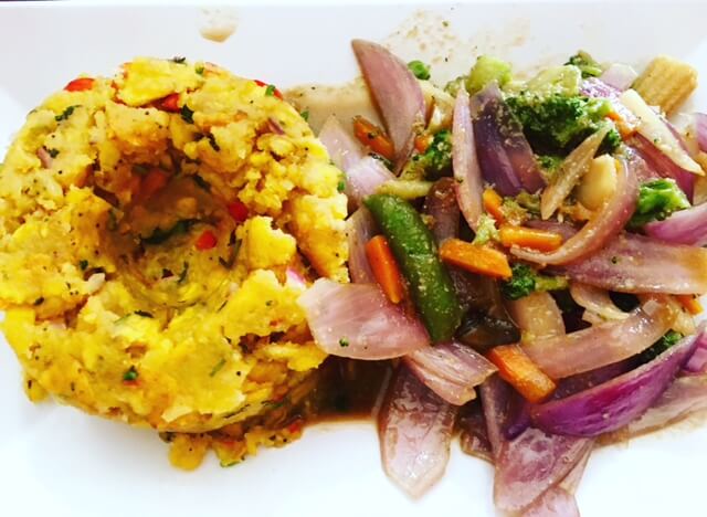 This was my first experience eating mofungo. After that I was obsessed and had it nearly every day! It is a very hearty plantain dish that is served with other foods. This version was served with a curried vegetable sauce. It was fabulous, and really pretty, too!