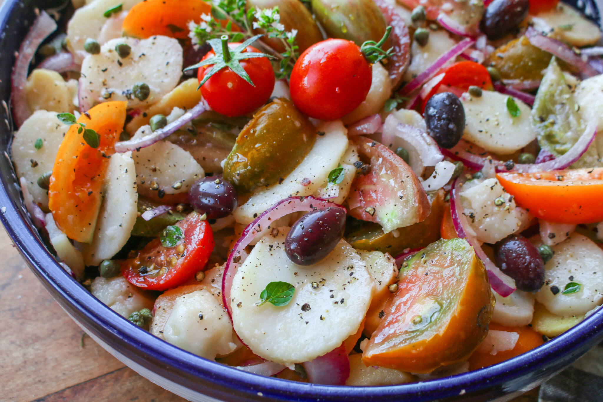 - Peel and slice the potatoes into slices and place them in a large bowl or large salad bowl, along with the tomatoes, onions, olives, and capers. Toss together gently.