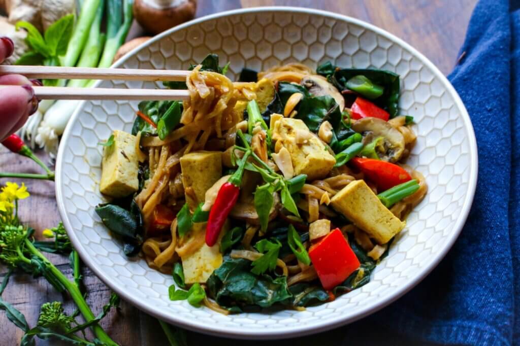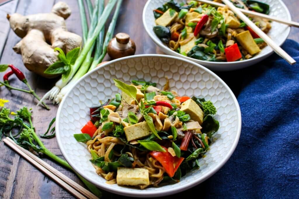 I have to let you in on a secret: This Noodle Bowl with Thai Tofu and Vegetables is one of my most popular recipes on my blog, and one of my most widely viewed cooking videos to date. I think it’s just stunning, with the bright pop of red, deep green leaves, and creamy coconut-curry sauce. One of the things I love most about this recipe is its versatility. For example, I always have greens growing in my garden—kale, mustard greens, beet greens, chard, and more. These nutritious green leafy veggies are so easy to grow in the garden, and they are so important to include in your diet, that I recommend eating them every day. So, you can easily use whatever greens you have growing in your garden for this dish, or rely upon those you snatch up at your farmers market or supermarket. You can also try different types of mushrooms or bell peppers to add a new twist to the recipe. And you can switch from tofu to seitan or tempeh for a different taste experience. No matter how you mix it up, I promise you’ll come back to this noodle bowl recipe again and again.