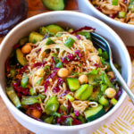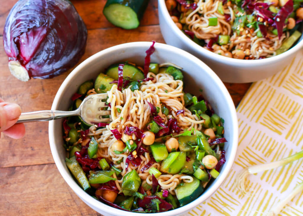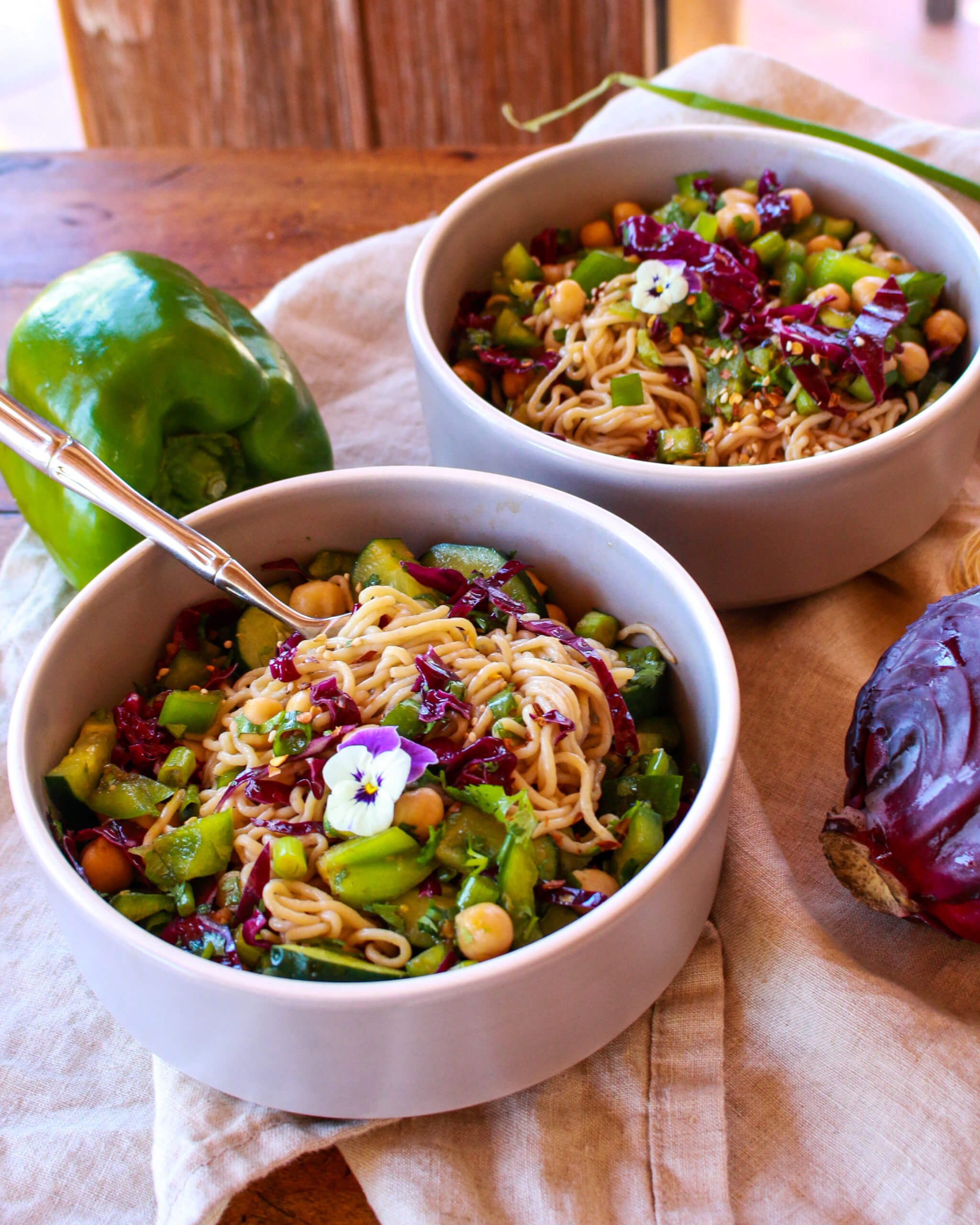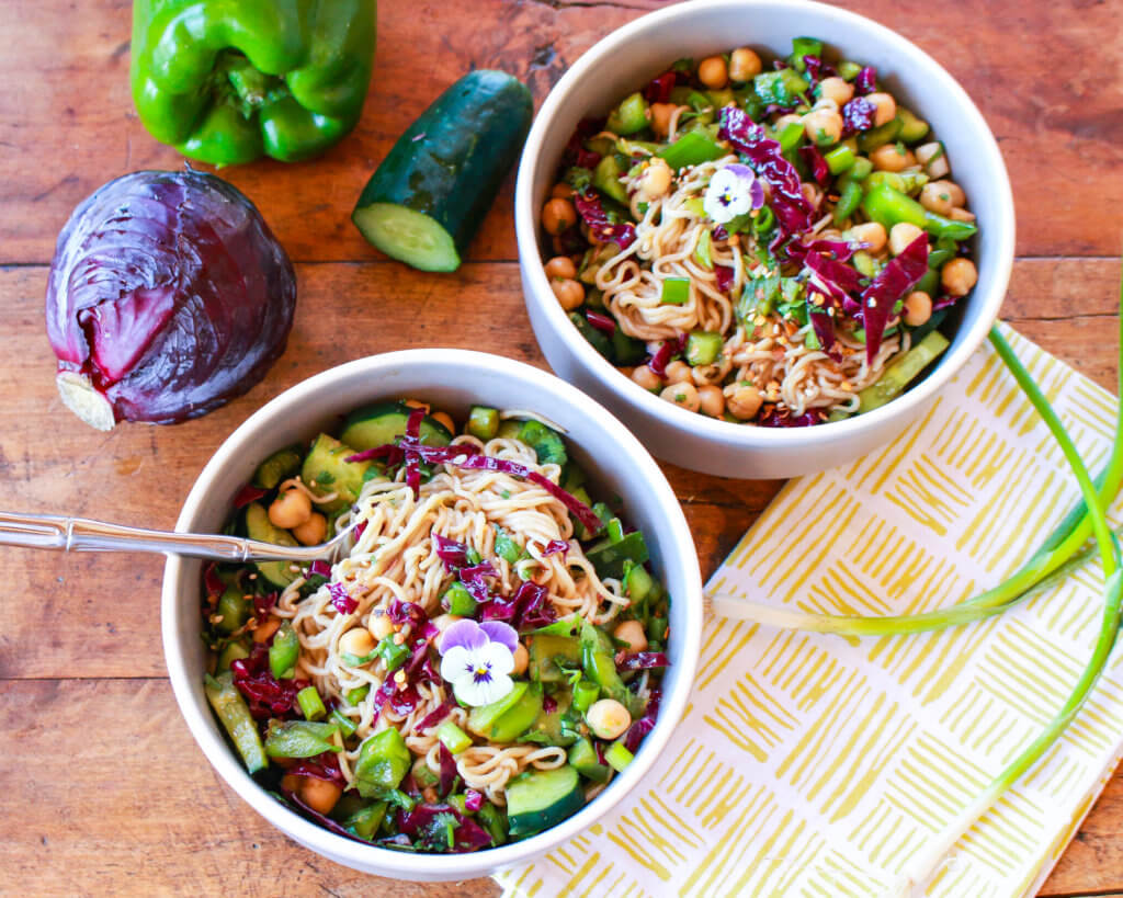 - Add cooled noodles to a large salad bowl and mix in bell pepper, cabbage, cucumber, green onions, chickpeas, cilantro and sesame seeds.