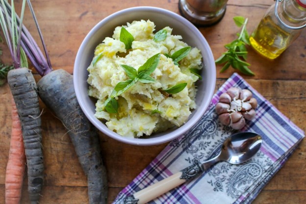 Mashed Potatoes and Heirloom Carrots with Basil, Garlic, and Olive Oil, Sharon Palmer, MSFS, RDN, The Plant-Powered Dietitian (shown above)