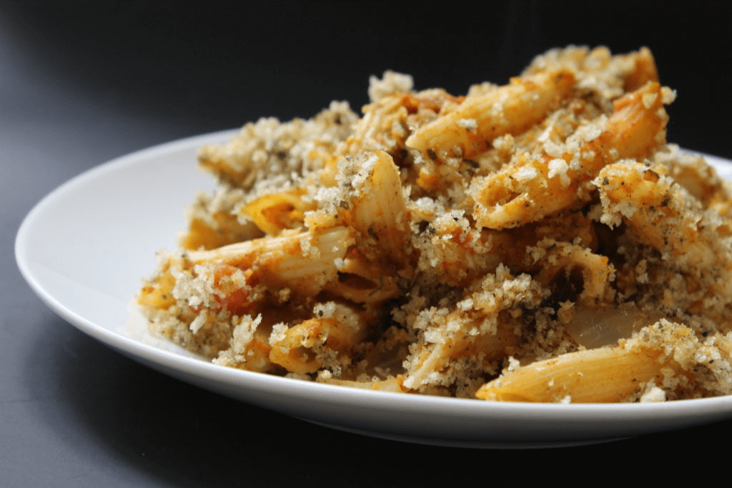 Tomato Pasta Bake with Garlicky Crumb Topping, Melanie McDonald, A Virtual Vegan (shown above)
