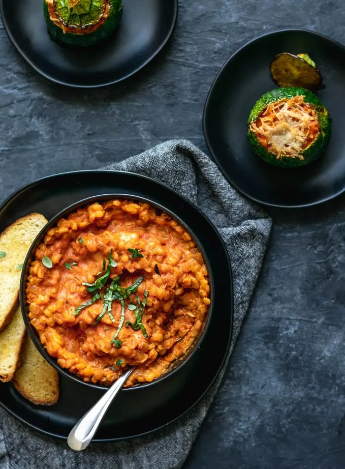 Creamy Vegan Barley Risotto Stuffed Zucchini, Eva Agha, The Curious Chickpea (shown above)