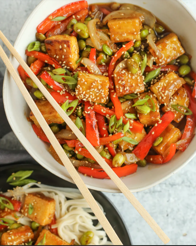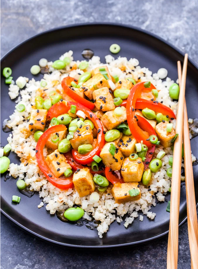 Stir Fry with Crispy Orange Tofu and Edamame, Cara Harbstreet, Street Smart Nutrition (shown above)