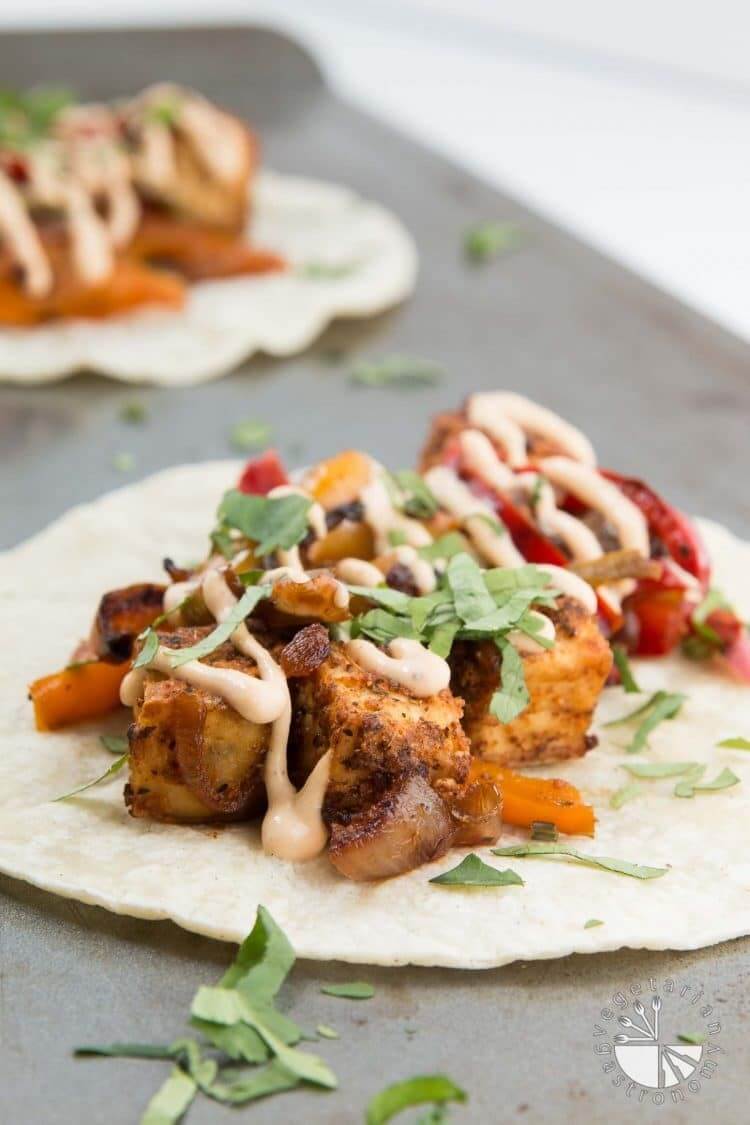 Crispy Tofu Tikka Masala Tacos with Peppers, Onions & Chilifire Crema, Anjali Lanali, Vegetarian Gastronomy (shown above)