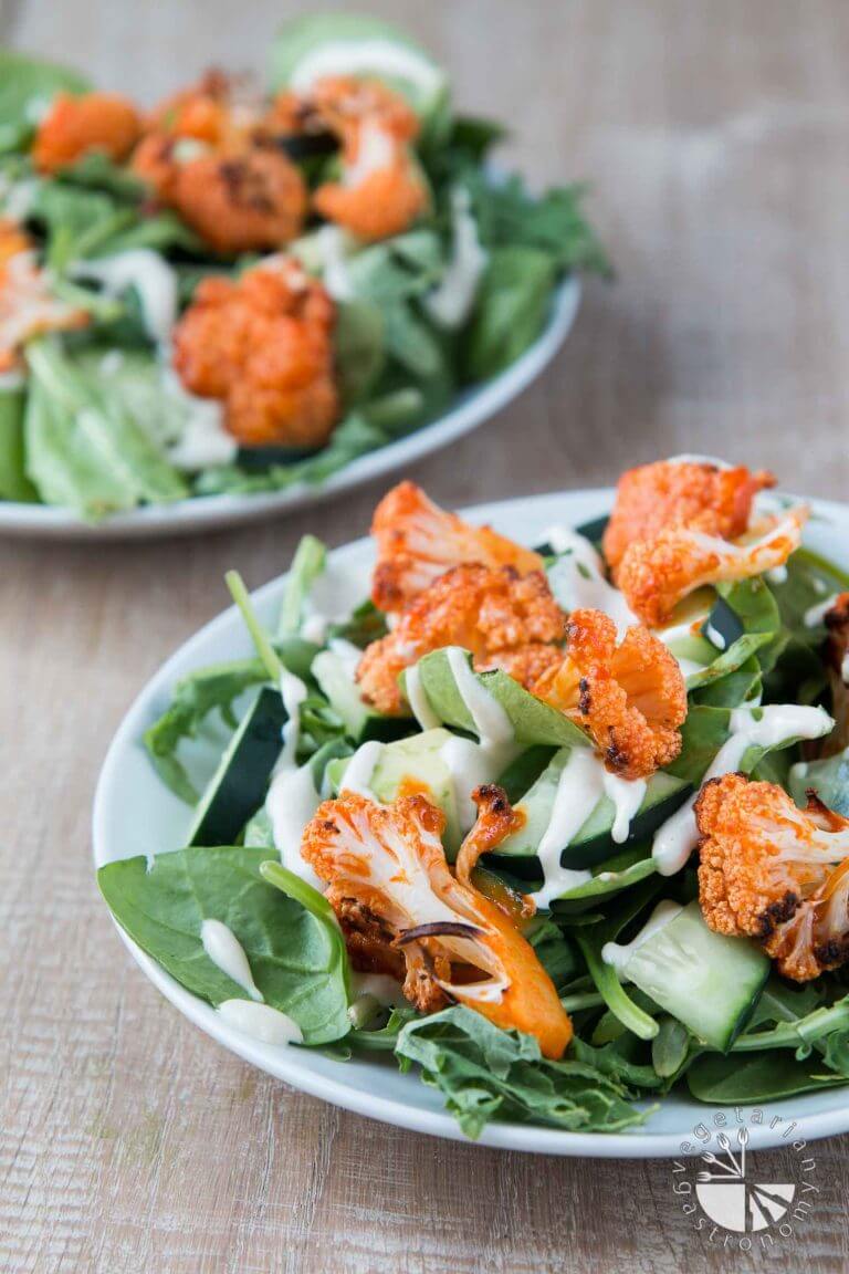 Mixed Green Salad with Buffalo Roasted Cauliflower, Avocado, and Cucumber Ranch Dressing, Anjali Lalani, Vegetarian Gastronomy (shown above)