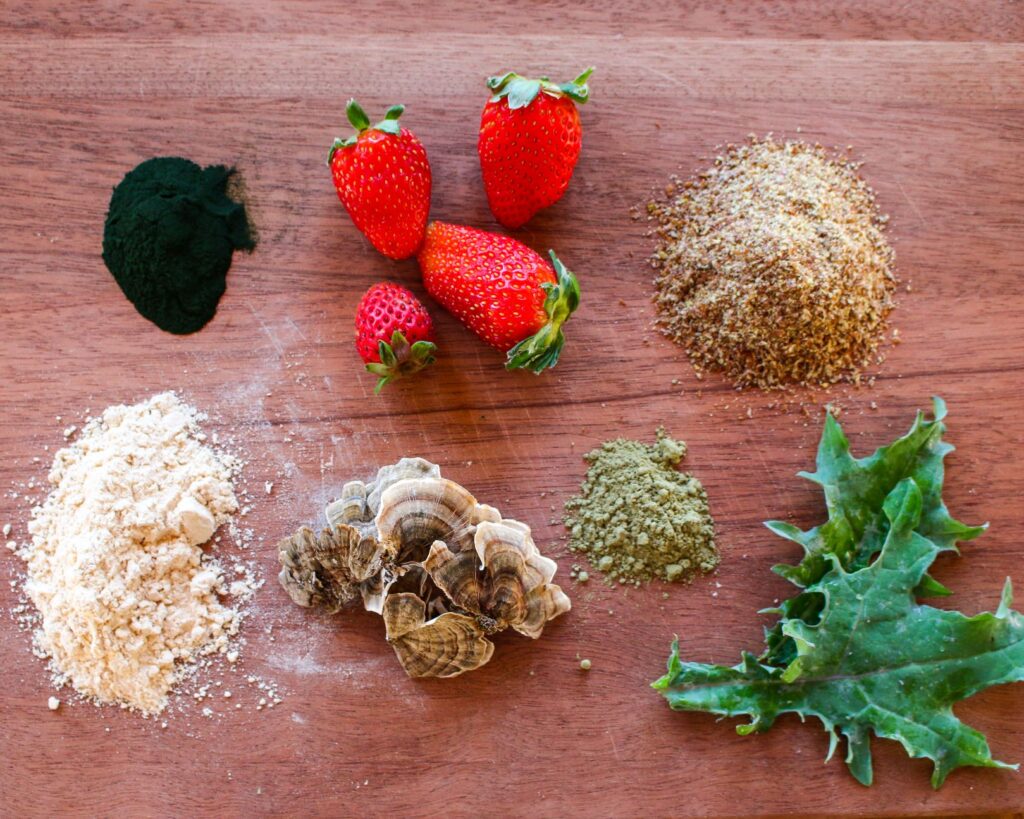 The main ingredients in the smoothie include (clockwise from top left) greens powder, berries, flax seeds, kale, green matcha tea powder, mushrooms (these are turkey tail), and plant protein powder.