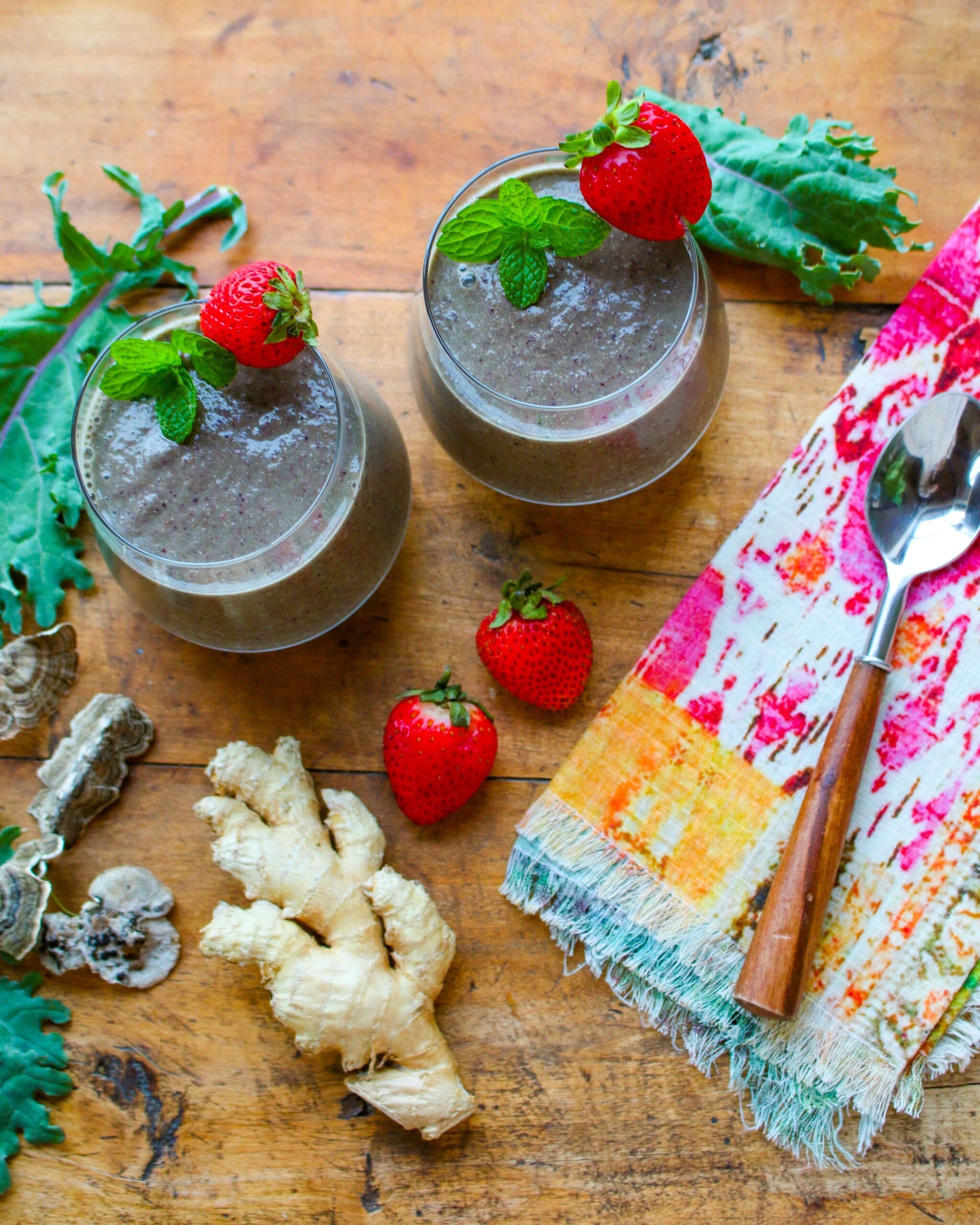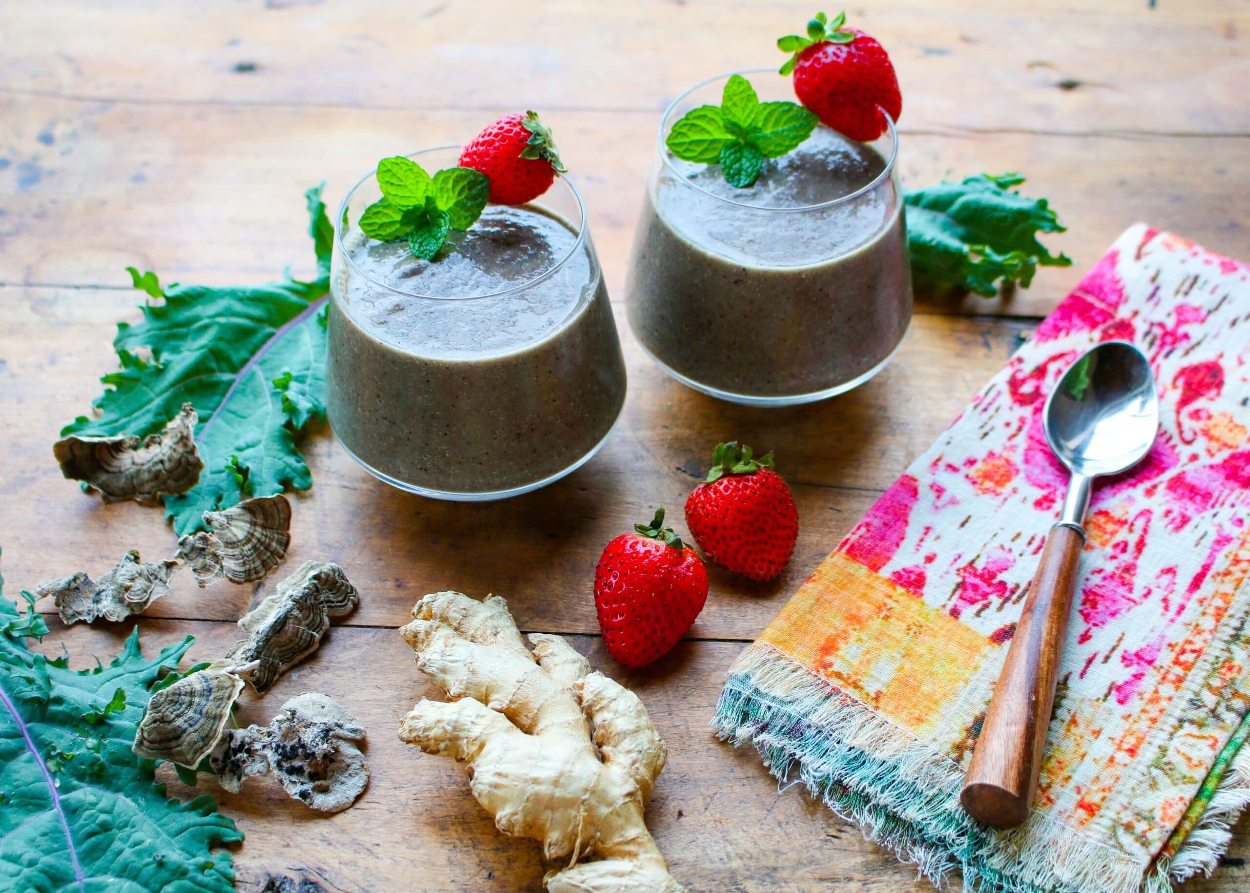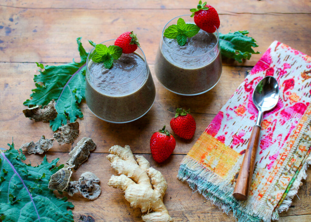 This antioxidant smoothie (vegan, gluten-free) provides a symphony of ingredients—berries, kale, flax, mushrooms, turmeric, ginger, green tea—to help fight cancer.