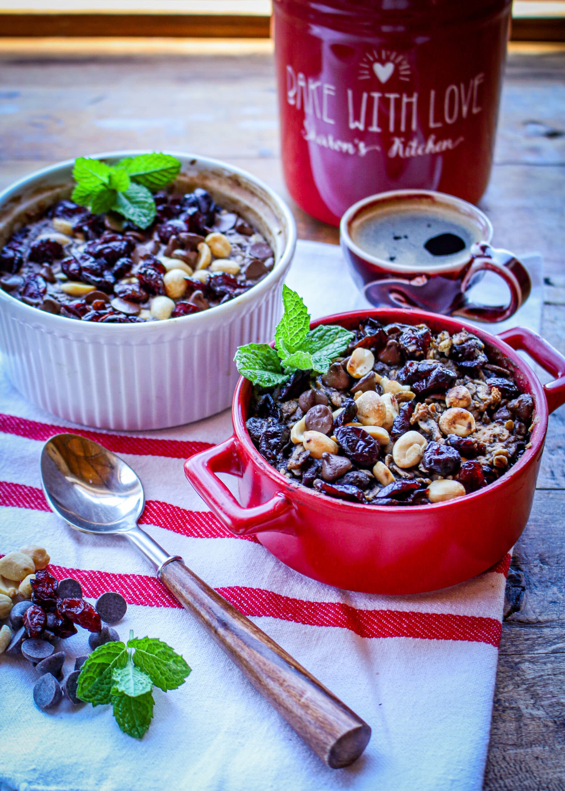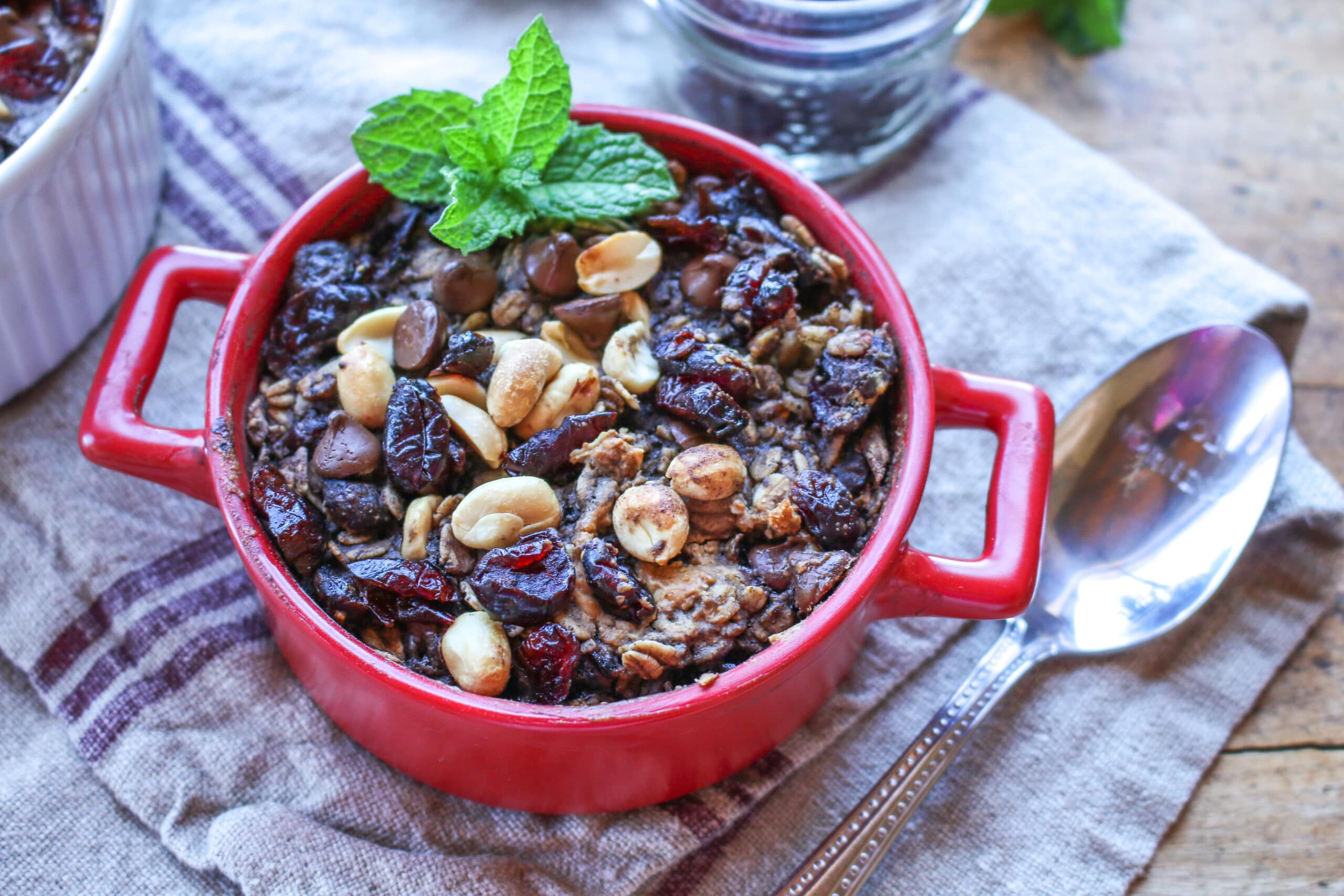 This delicious, healthy, gluten-free, vegan recipe for Baked Peanut Butter Chocolate Cranberry Oats can be mixed up with a few pantry ingredients in only 5 minutes!