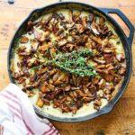 Make this easy oven-baked polenta and mushrooms skillet featuring creamy polenta, oven roasted mushrooms, and fragrant thyme. This vegan, gluten-free recipe is perfect as a main dish, side dish, or festive holiday entrée.