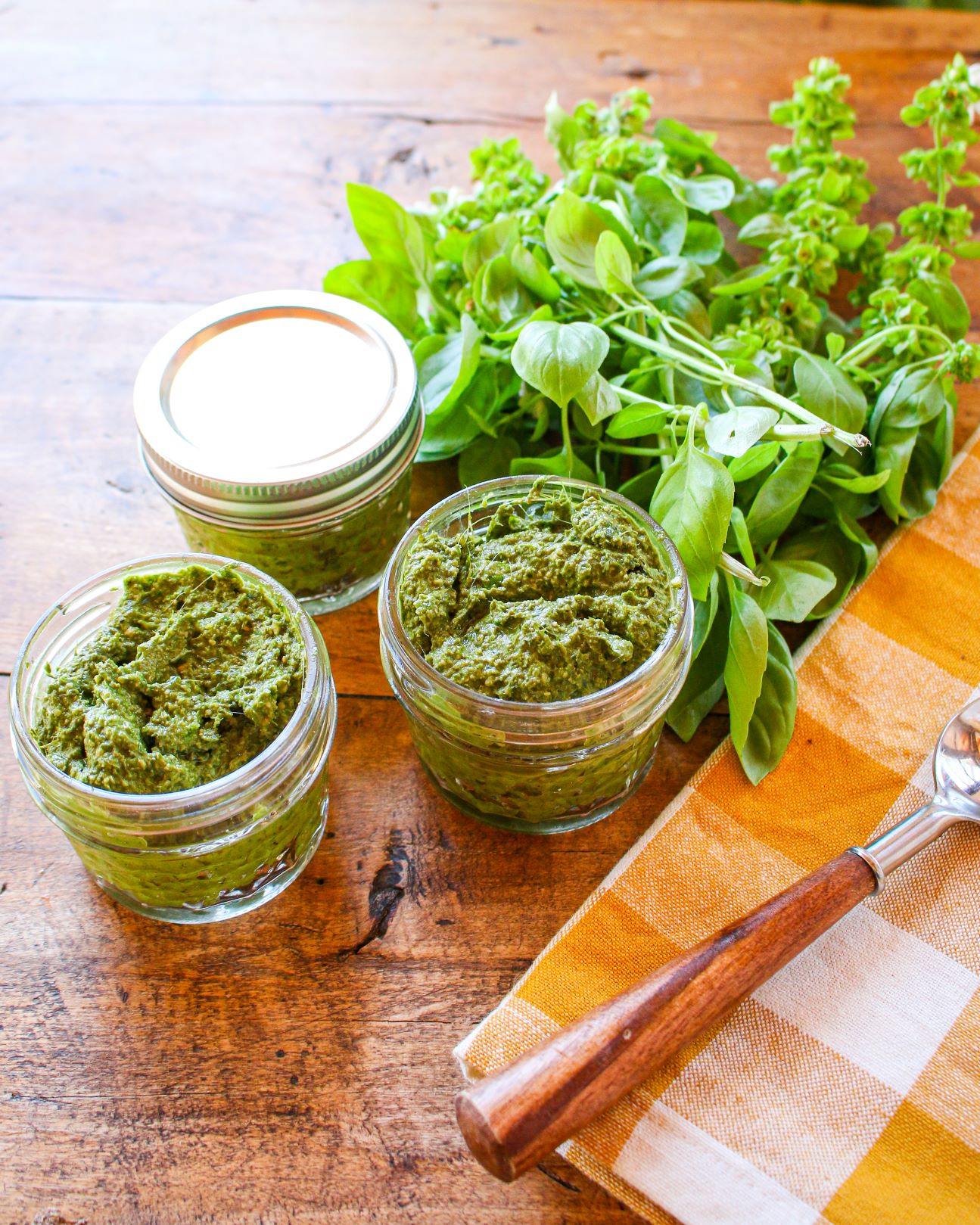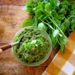 I grow fresh basil each year in the summer, and I love to make a big batch of pesto to divide into small containers and freeze for use all year long. With this customizable recipe, you can make a variety of pesto types, such as pumpkin seed pesto, walnut pesto, chia seed pesto, and almond pesto. The choice is up to you! Once you have your pesto ready, serve it with fresh pasta, salad recipes, sandwiches, wraps, breakfast scrambles, veggie-burgers, and more! It’s just that versatile. And it elevates the flavor of your dishes so much with that deep minty-green basil goodness, pungent garlic flavor, and velvety olive oil texture.
