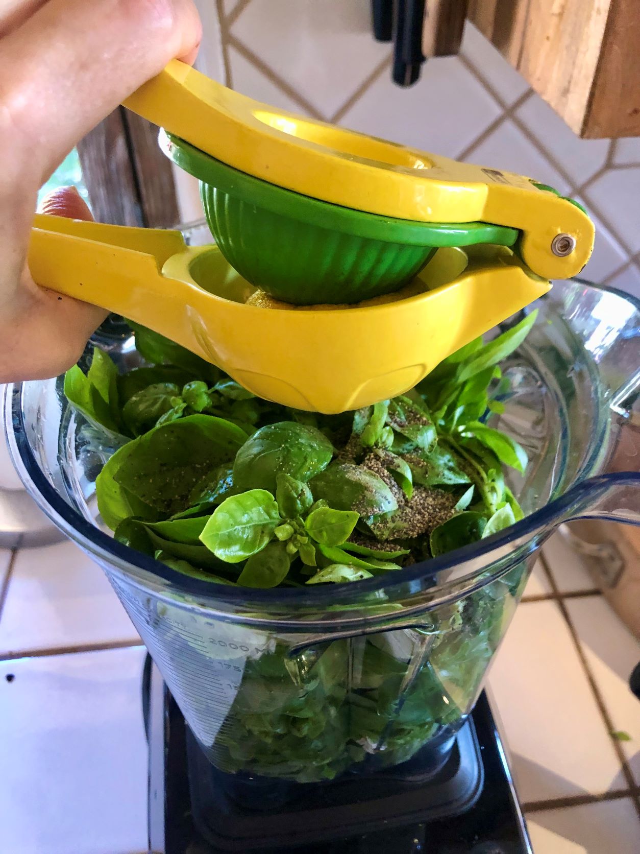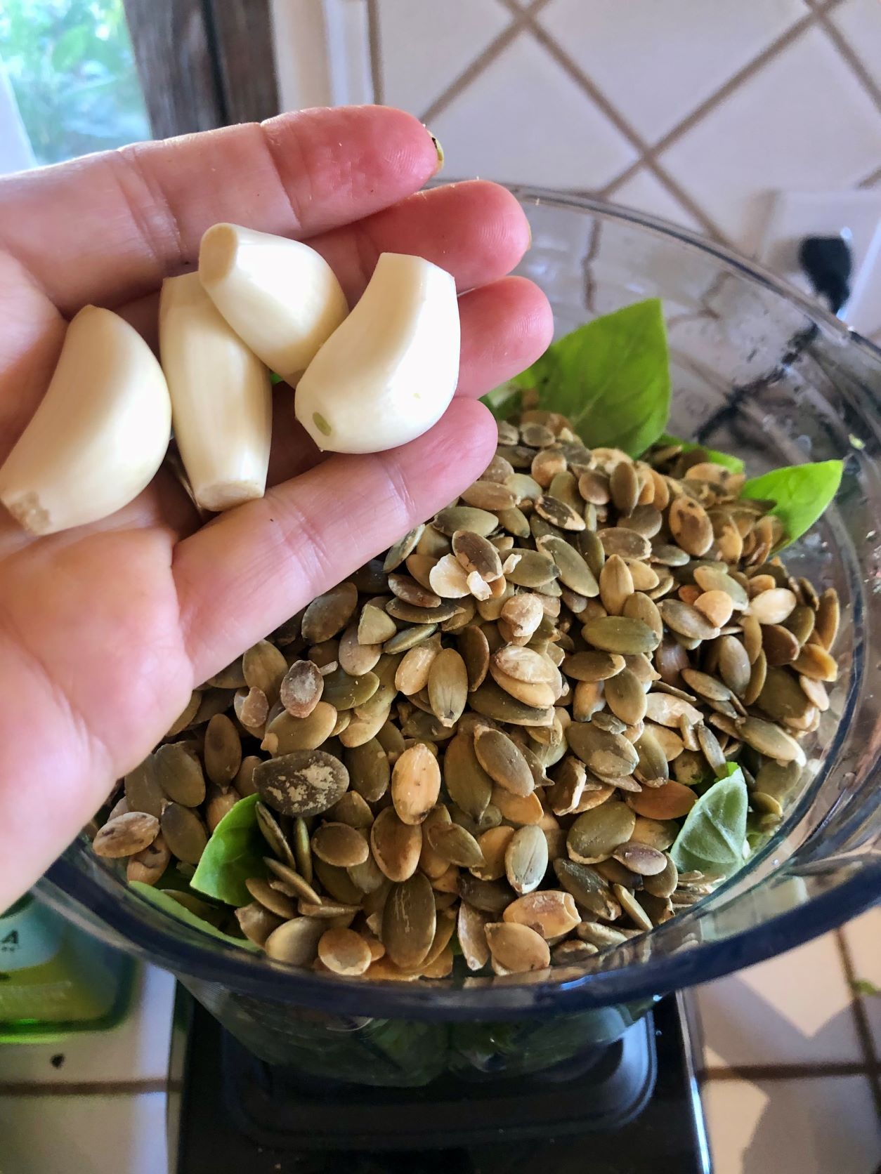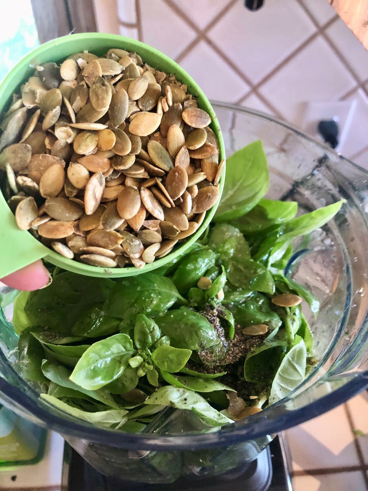 Place fresh basil in blender.Season with black pepper.Season with salt.Add lemon zest and freshly squeezed lemon juice.Add olive oil.Add desired nuts or seeds (pumpkin seeds pictured above).Add garlic cloves.Process until smooth and creamy, stopping to scrape down sides frequently.