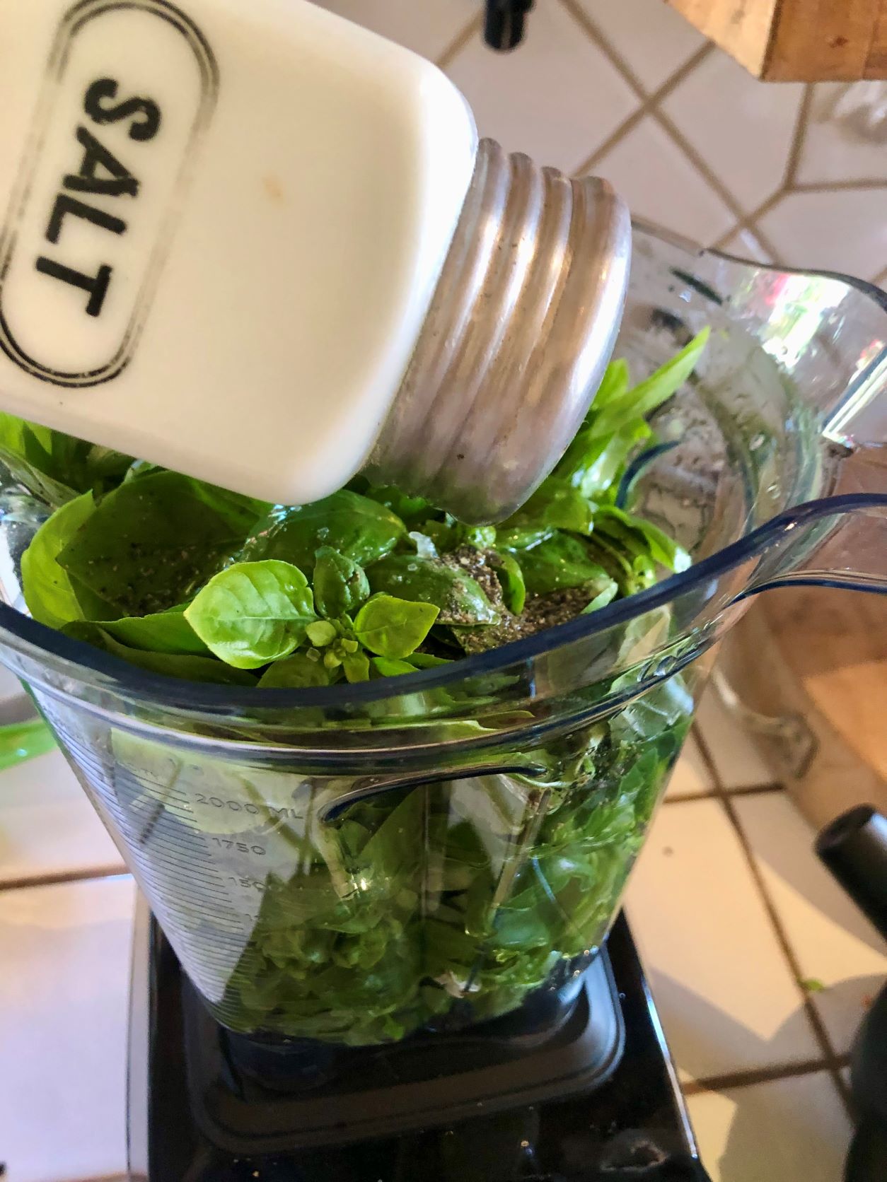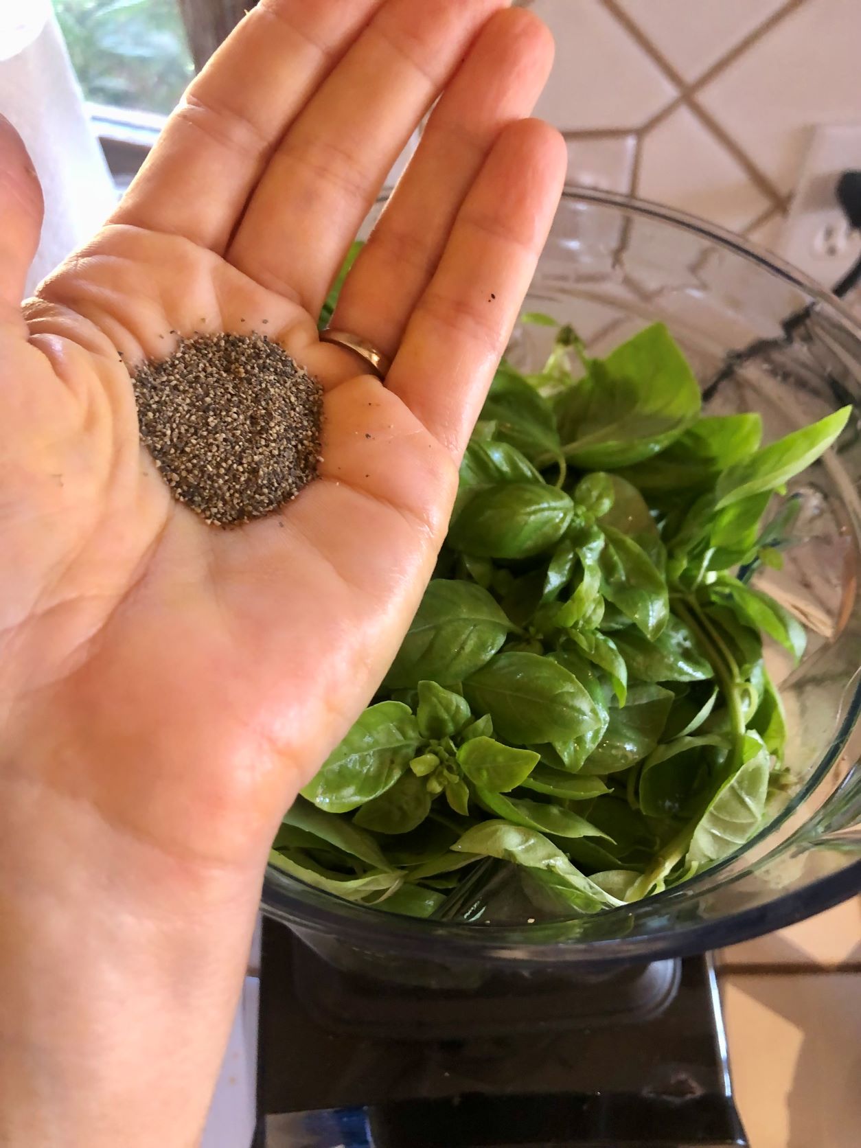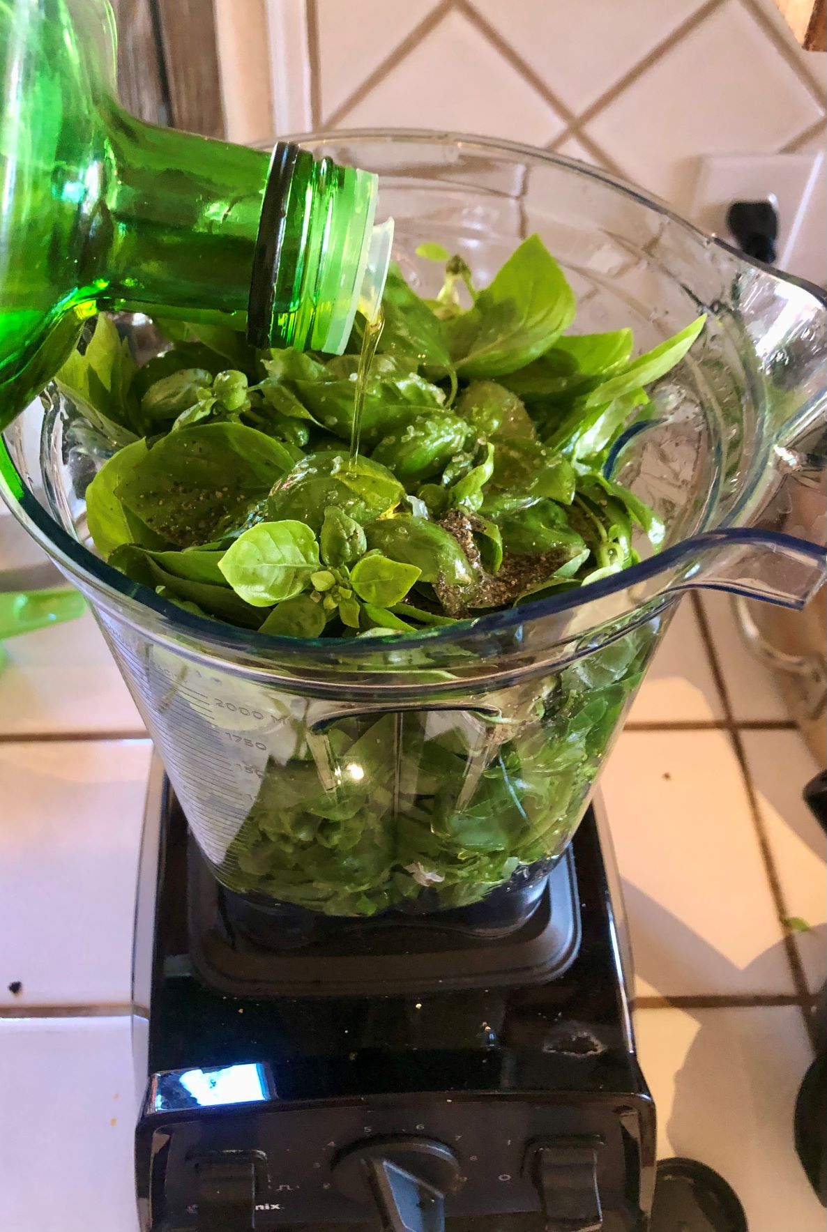 Place fresh basil in blender.Season with black pepper.Season with salt.Add lemon zest and freshly squeezed lemon juice.Add olive oil.Add desired nuts or seeds (pumpkin seeds pictured above).Add garlic cloves.Process until smooth and creamy, stopping to scrape down sides frequently.