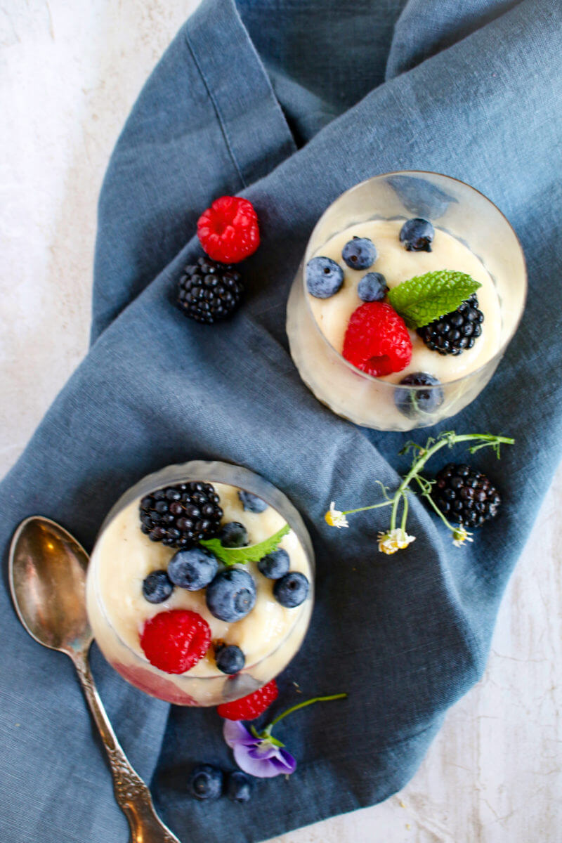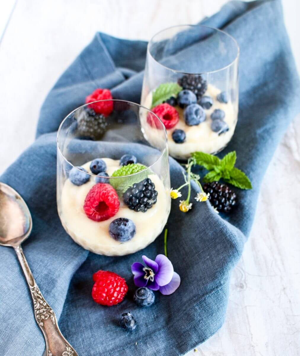 This super easy, healthy, plant-based take on the classic pudding can be whipped up in 10 minutes with only 5 ingredients (not including pantry staples). Nutrient-rich, low in fat, and sweetened with just a hint of maple syrup and the natural sweetness of berries, this is a treat (with only 136 calories) you can feel really good about! It’s also a completely gluten-free recipe for those that avoid gluten. Make up a batch of the vanilla cream pudding, top it with berries, and seal them up into mason jars to take with you for lunch on the go. In fact, this recipe is healthful enough you can serve it as nutrient-rich snack.