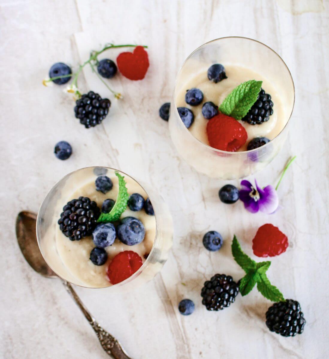 I remember my mom making simple, home-made puddings out of a few, very basic ingredients—milk, sugar, vanilla, and cornstarch. This inspired me to turn her classic recipe into an easy, plant-based (vegan) pudding dessert: Berries and Vanilla Cream. The classic pudding recipe arose out of the British tradition of making something out of nothing. While the first puddings were made out of savory ingredients, they later started including fruits and nuts. American boiled sweet puddings started showing up in the 19th century, making them one of our favorite, classic comfort foods. One of my father’s all time favorite foods is tapioca pudding—a derivation of the classic American boiled pudding.