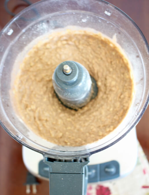 - Place berry applesauce, tahini, maple syrup, vanilla, flour, oats, flax seeds, baking powder, and salt in the container of a food processor or high-powered blender. Process until smooth—about 2-3 minutes.