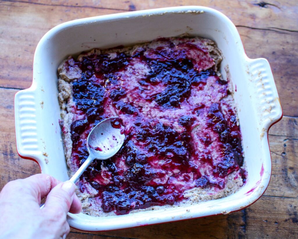 - Place fruit spread/jelly in a small dish and mix in water until smooth. Spoon over batter evenly and place pan in the center of the oven.